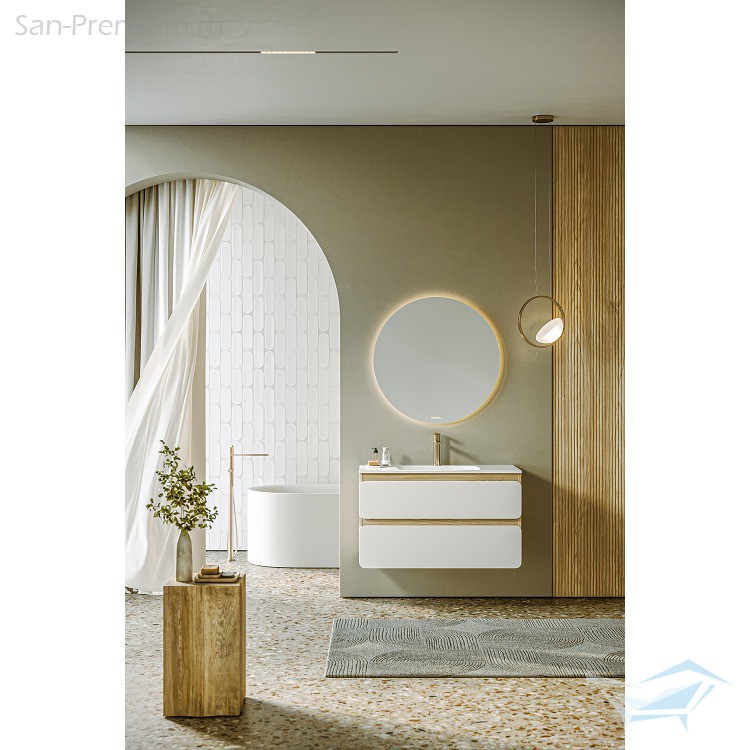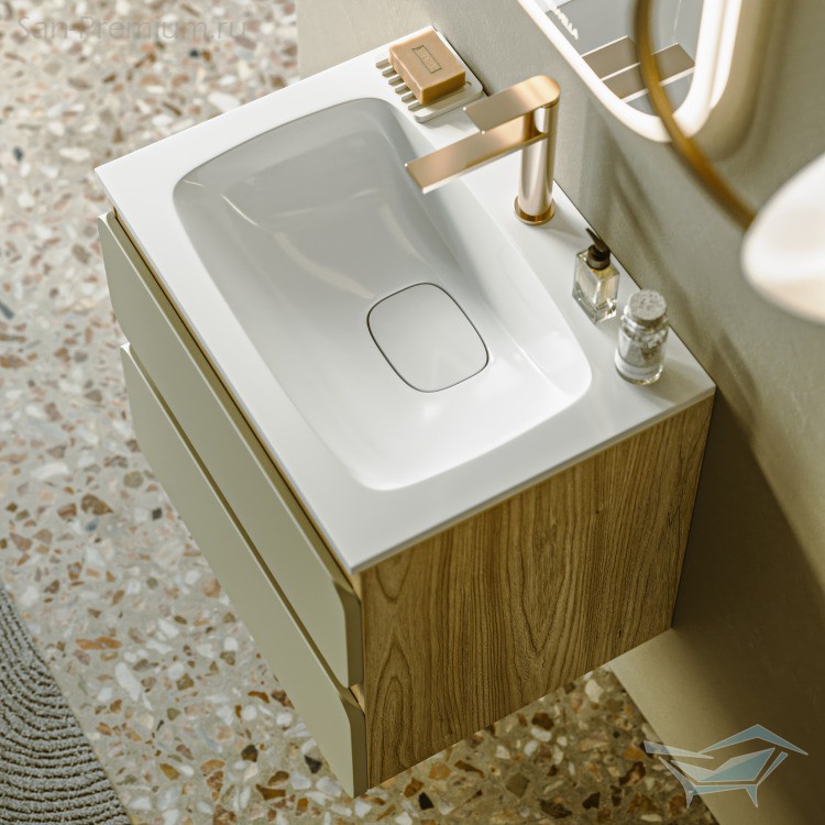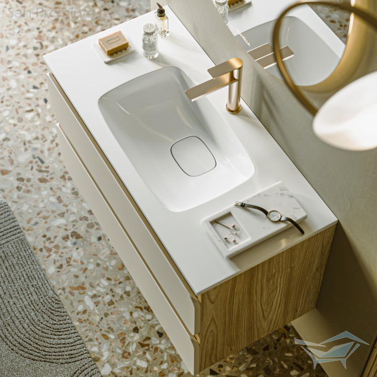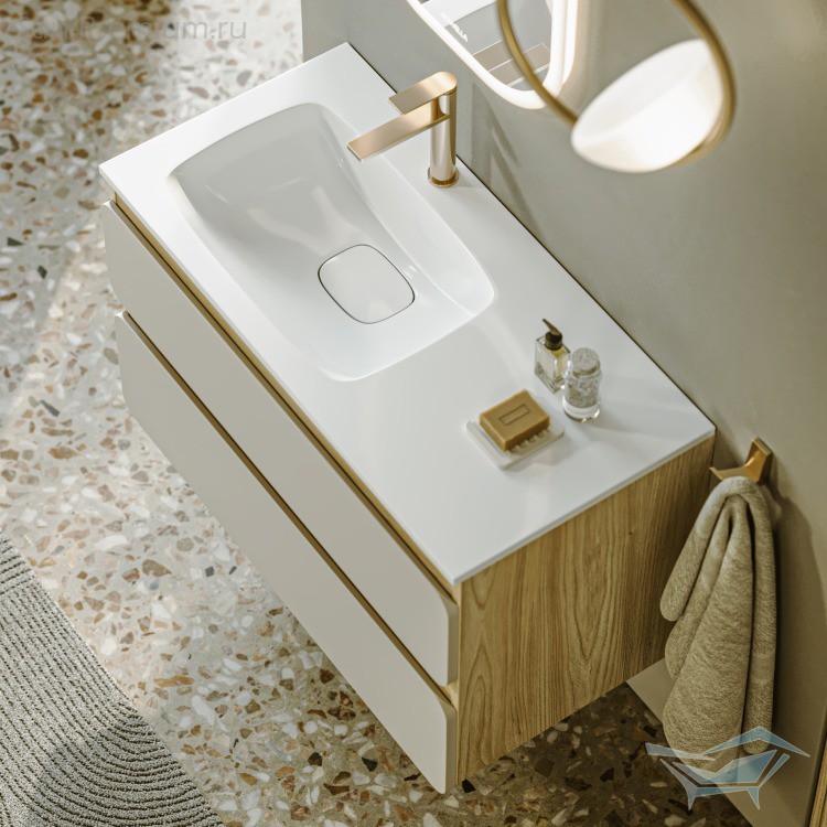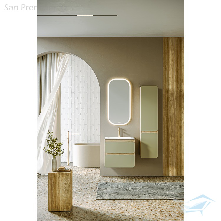 Цветовая палитра коллекции включает сдержанные и благородные оттенки: белый матовый, морская дюна и шалфей зеленый. Ощущение свободы проявляется и в вариативности комплектации: корпус и фасады поставляются отдельно, позволяя адаптировать мебель под различные интерьерные решения – от минималистичных городских пространств до природных и спокойных интерьеров. Разнообразие размеров (60, 75, 90 и 100 см) делает коллекцию универсальной, а версия тумбы 90 см с асимметричным умывальником, смещенным влево, отражает динамику современной жизни, когда все необходимое должно быть под рукой и в нужном месте.