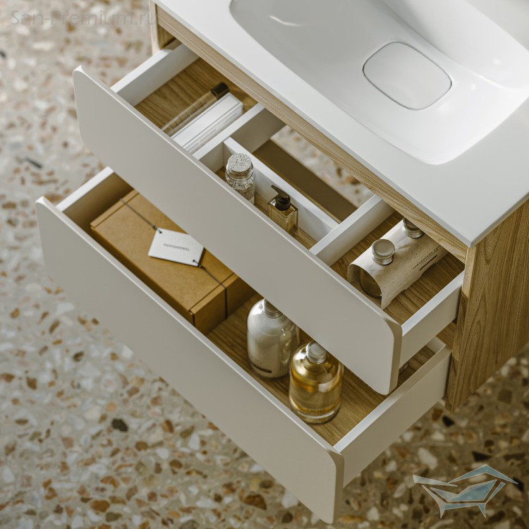 Тумбы Vento оснащены умывальниками Malaga из литьевого мрамора, сочетающими четкую геометрию с мягкой пластикой линий. Глубокая практичная чаша обеспечивает комфортность в использовании, а декоративная заглушка в сливной зоне сохраняет чистоту поверхности и архитектурную строгость. Внутреннее пространство продумано до мелочей: дно ящиков выполнено в цвет корпуса, а в верхний ящик установлена система организации внутреннего пространства в виде трех перегородок из ЛДСП. Это создает чувство цельности и порядка даже при открытых ящиках.