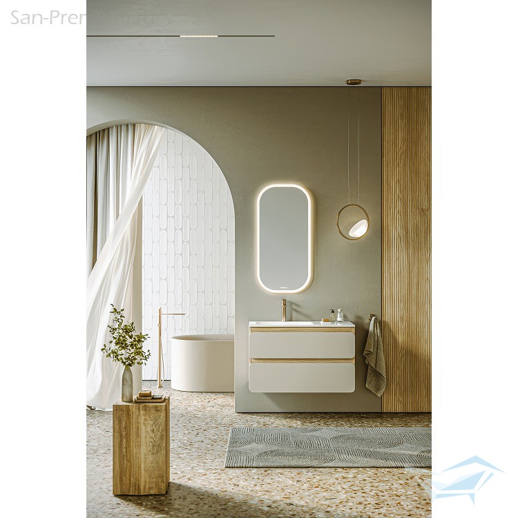 Коллекция мебели для ванной комнаты Vento – это архитектурное состояние пространства. Вдохновленное итальянским словом «ветер» концепция Vento – про незаметное, но ощутимое, привносящее в интерьер движение и ощущение свободы. Созданная в стиле софт-минимализма, Vento отличается мягкой геометрией и визуальной тишиной. Скругленные фасады окрашены матовой краской, также они выполняют функцию скрытых ручек. Фасады подчеркивают чистоту форм, не перегружая пространство и придавая интерьеру элегантность. Светлый древесный корпус из ЛДСП в оттенке светлой акации добавляет теплоту и глубину, мягко взаимодействуя со светом и создавая атмосферу спокойствия и архитектурной гармонии.