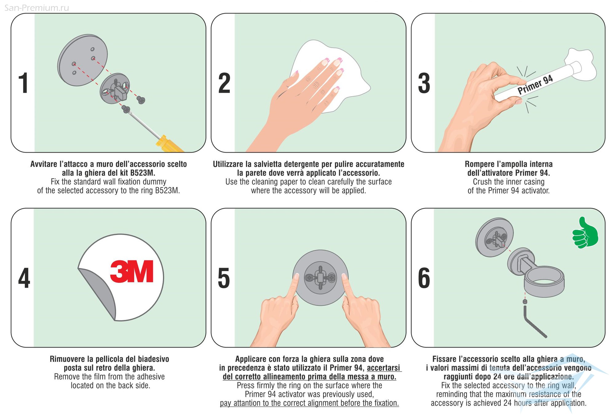 Клейкие ленты уже предварительно нанесены на изделие, а для подготовки поверхности стены внутри коробки находится набор для чистки и палочка с активатором/грунтовкой.