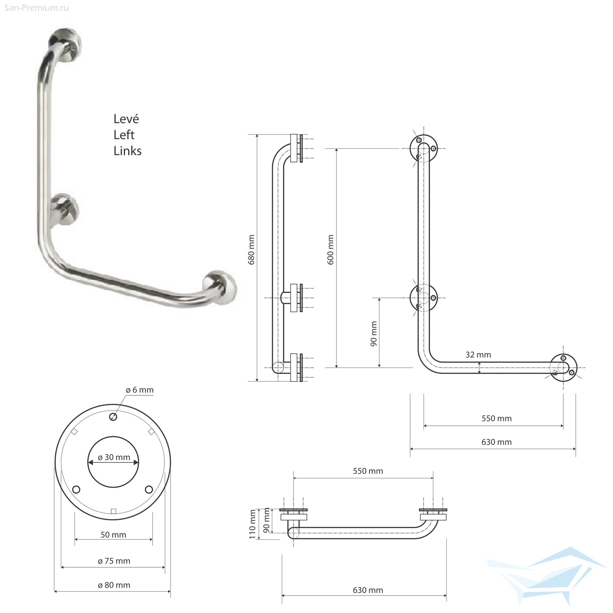 Поручень для душа Bemeta Help 680, левый, с крышками, полированная сталь 301112071