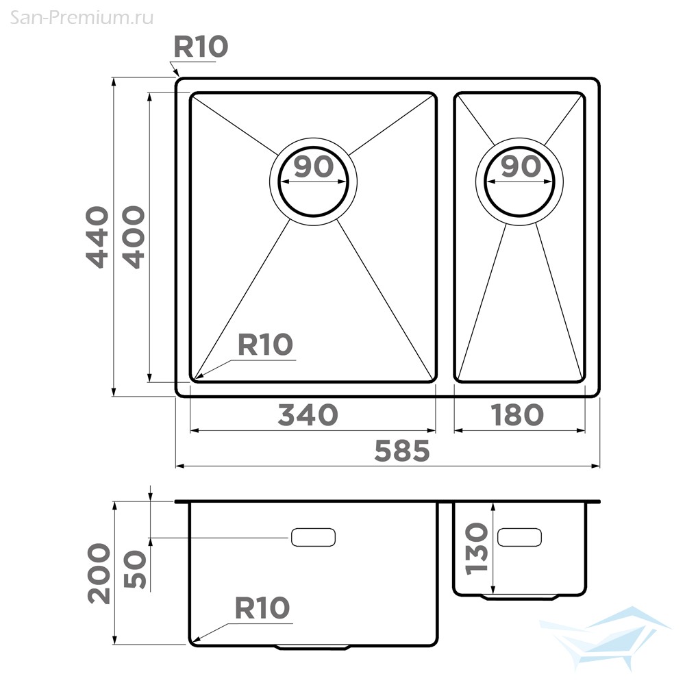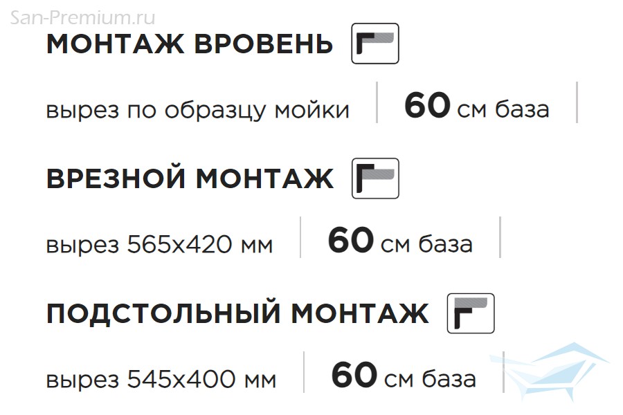 - Монтаж: вровень со столешницей, на столешнице, под столешницу