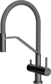 - Практичный однорычажный смеситель выполнен в современном стиле и снабжен высоким поворотным изливом и вытяжным шлангом