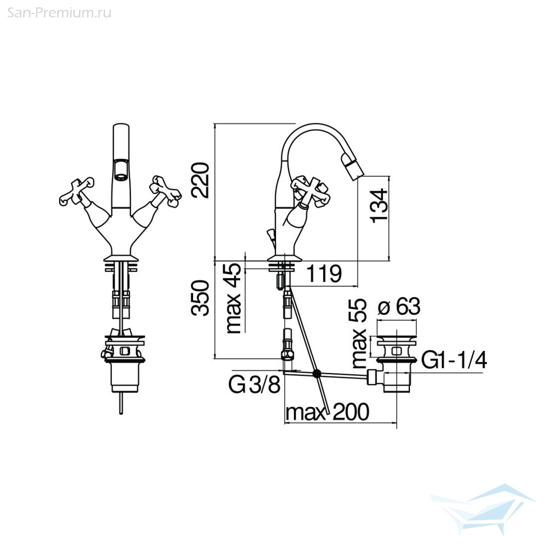 - подключение: гибкие соединительные шланги из нержавеющей стали 350 мм, G 3/8"