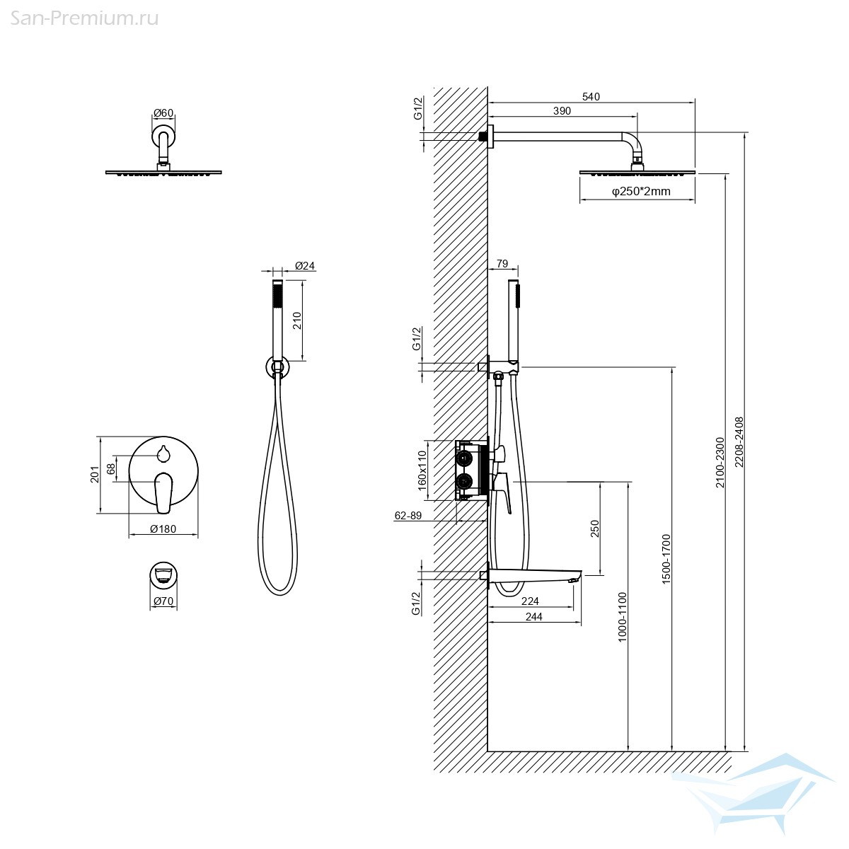 - Комплектация: держатель душевой лейки, излив, верхний душ, ручной душ, смеситель, шланг душевой