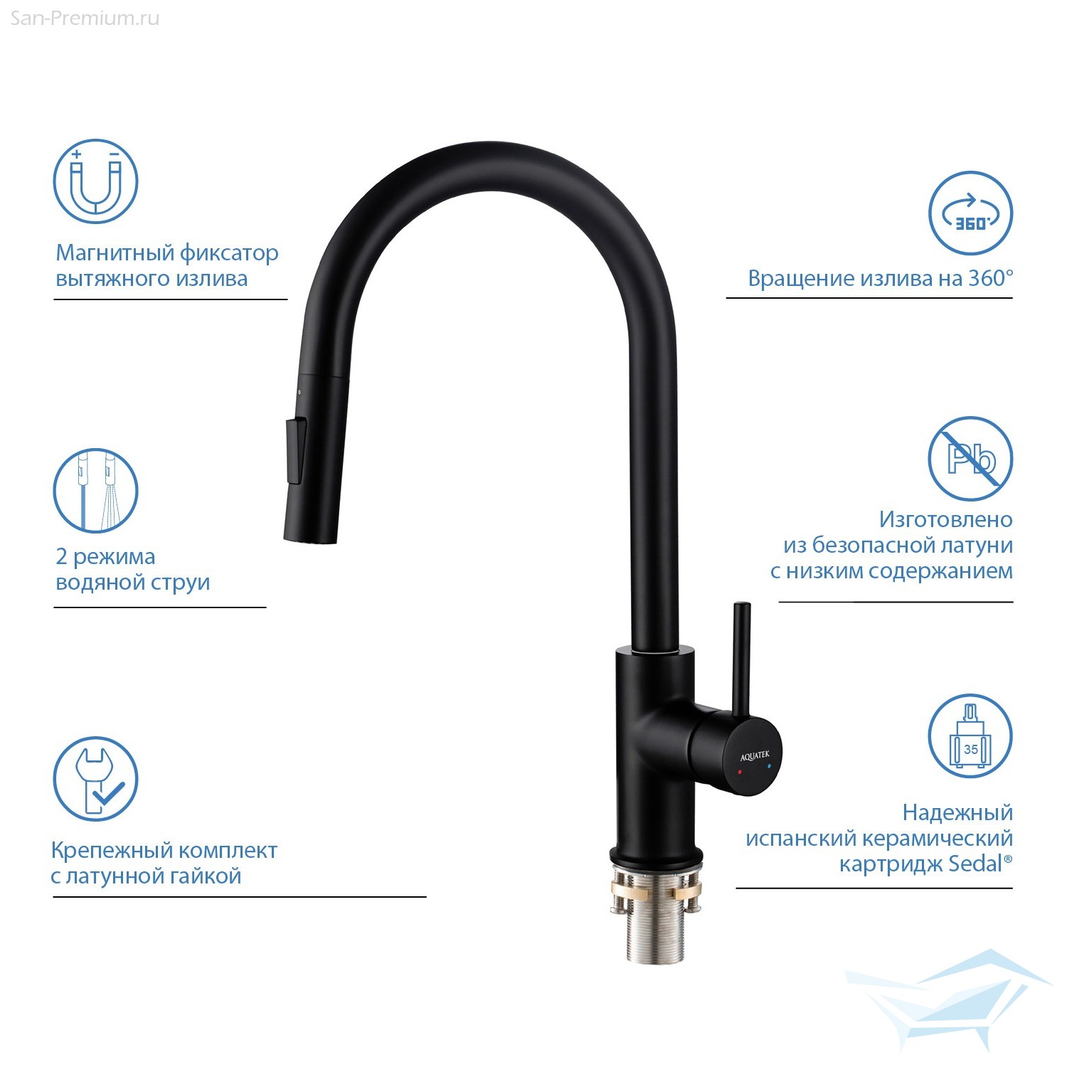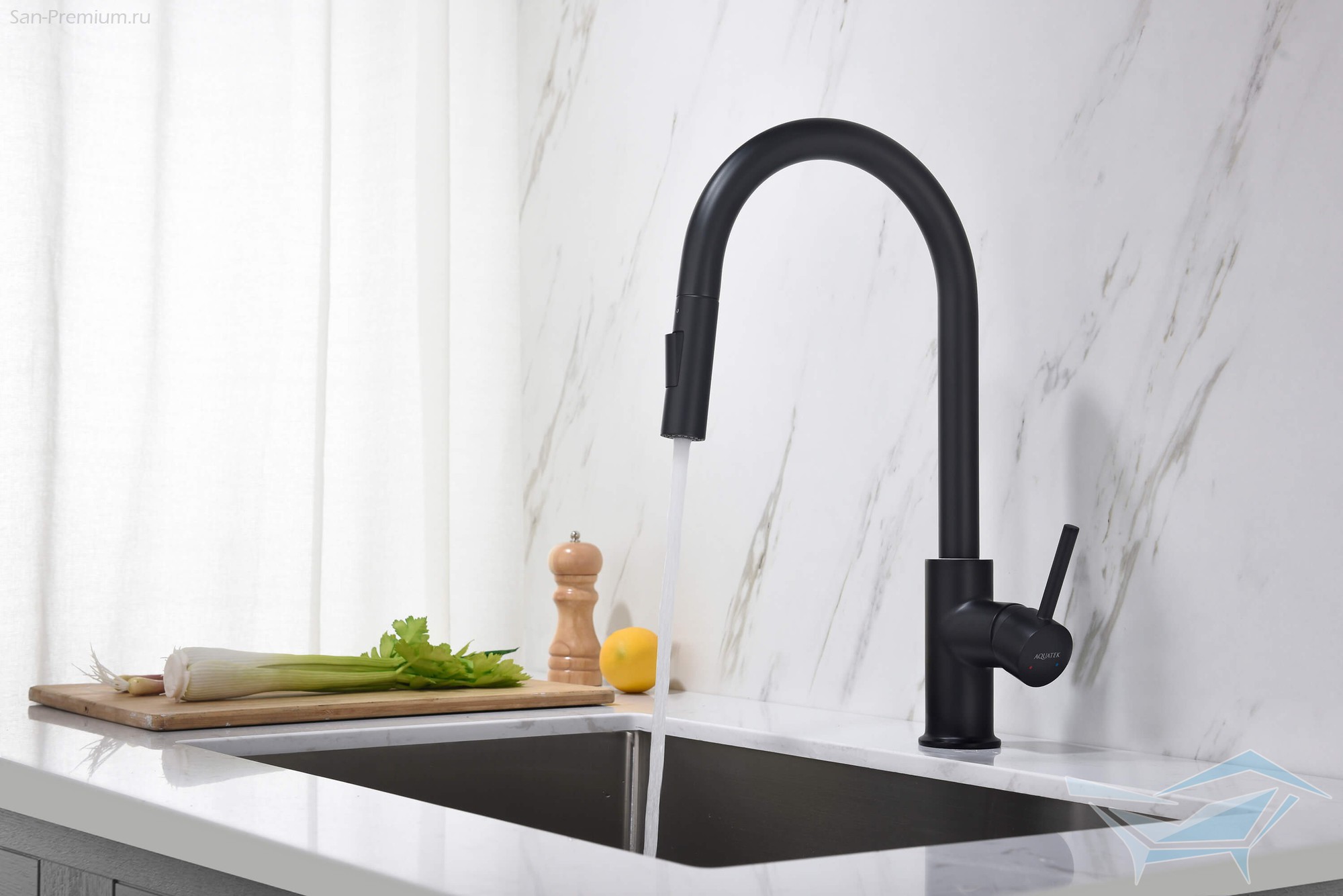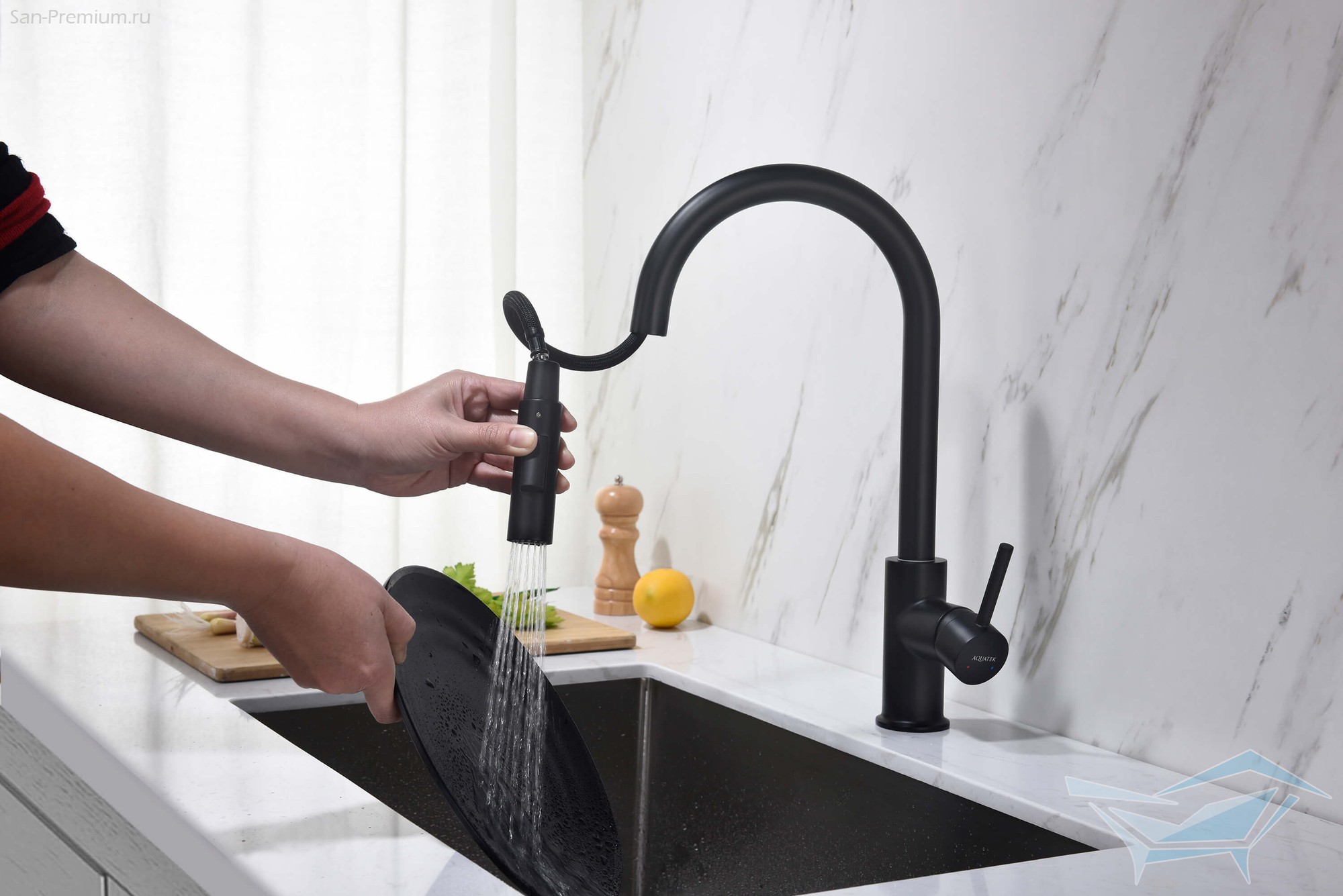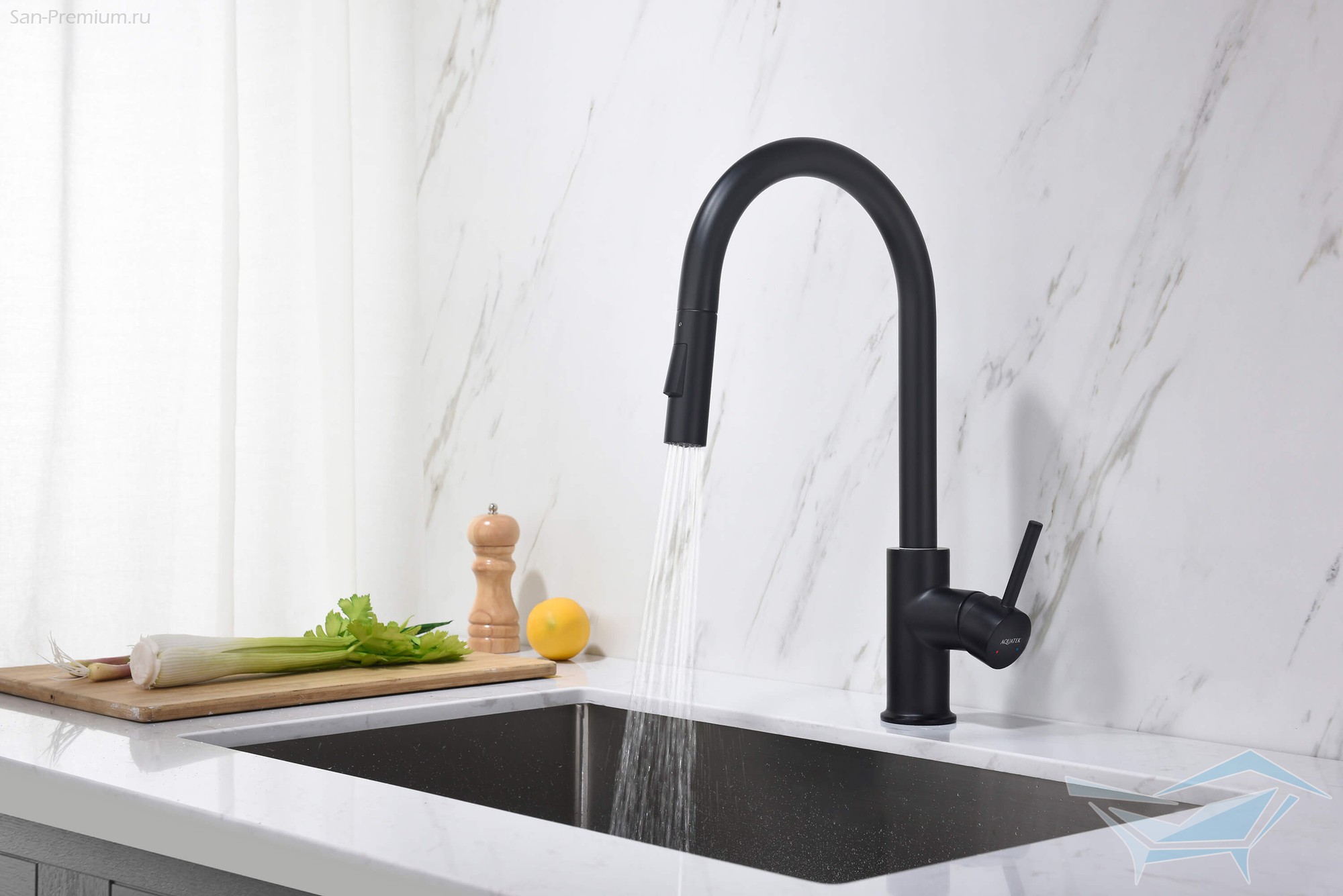 Смеситель для кухни Aquatek Европа, выдвижной излив 2jet, чёрный матовый