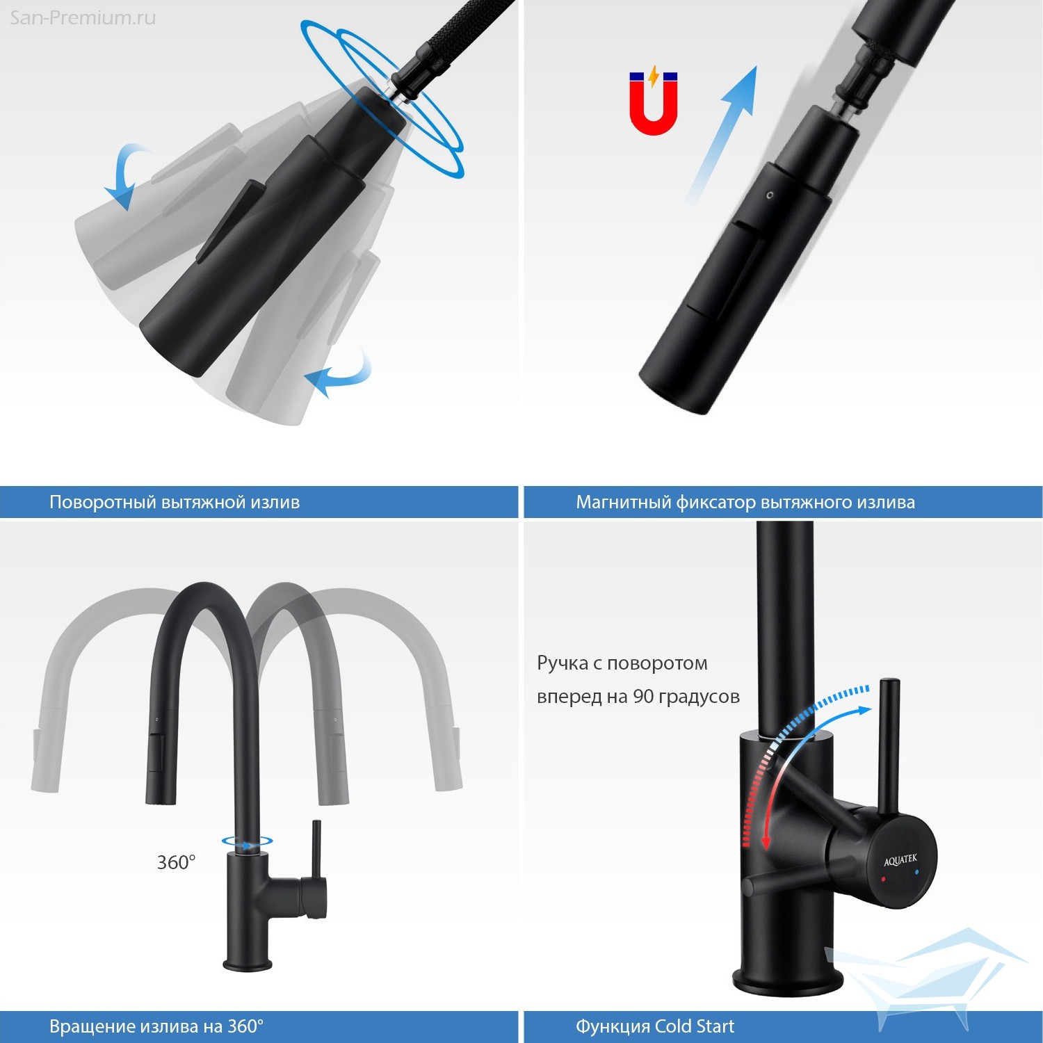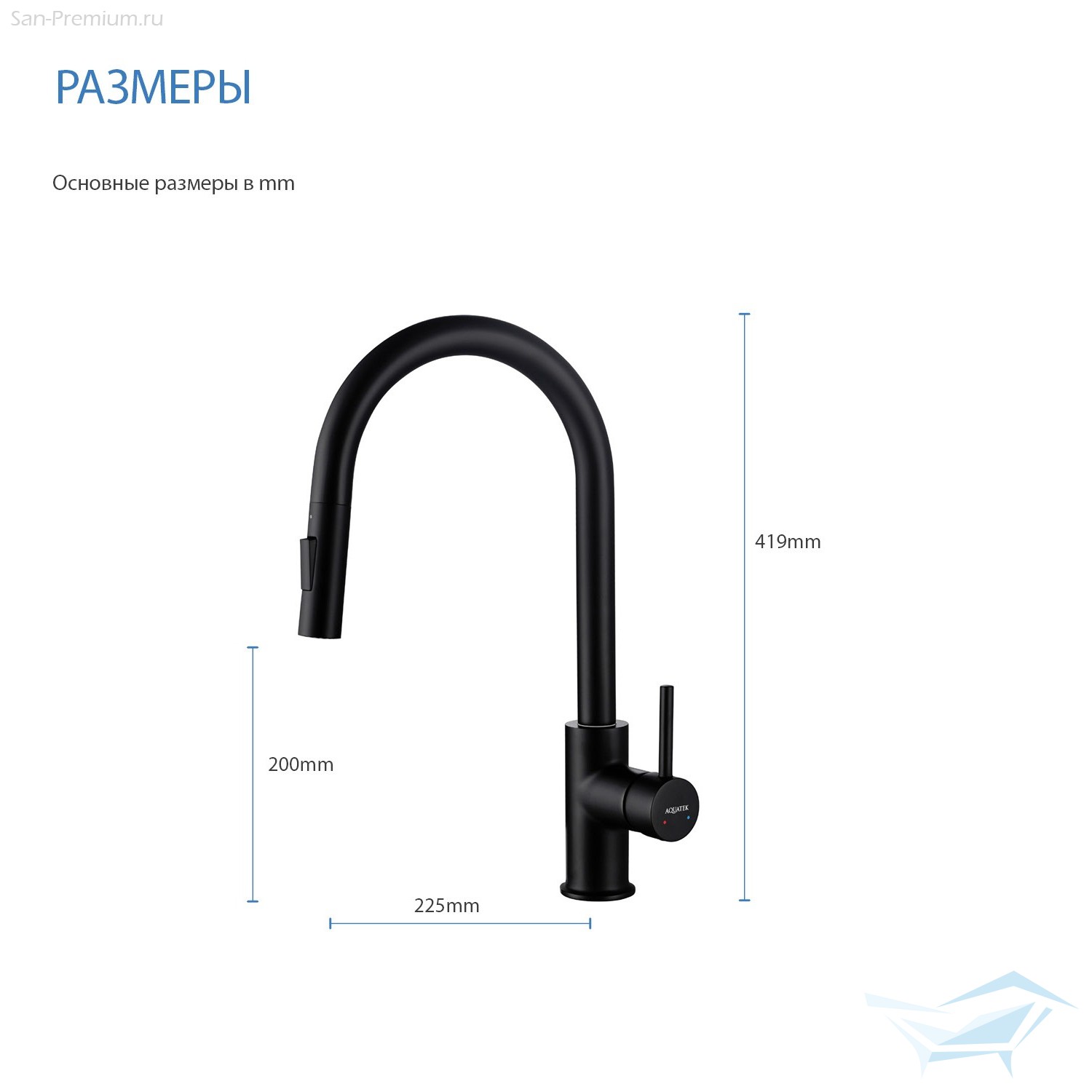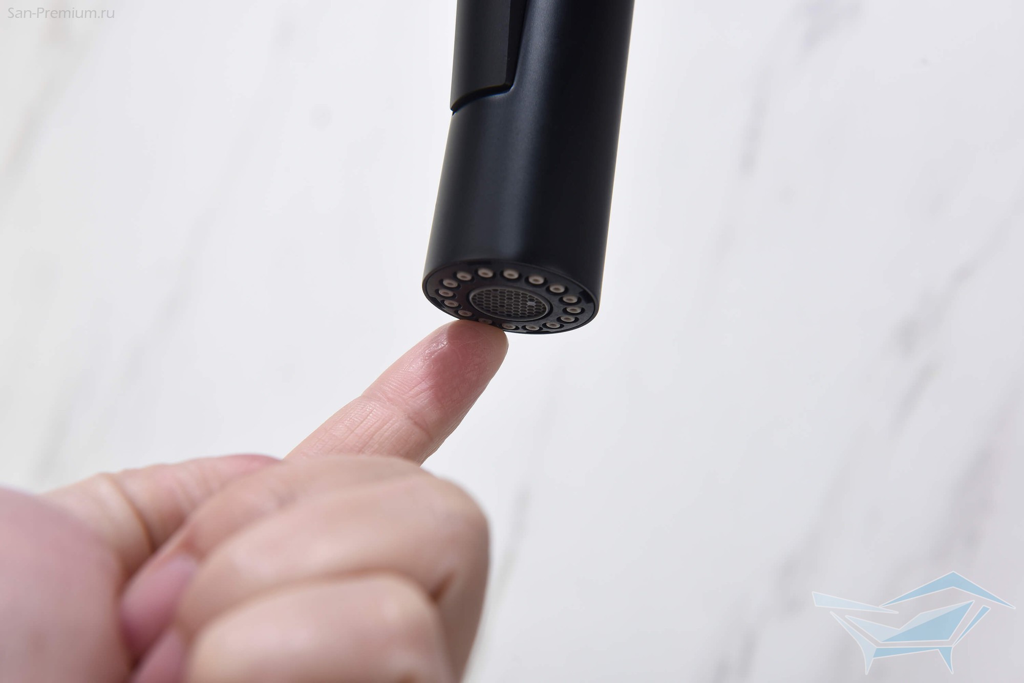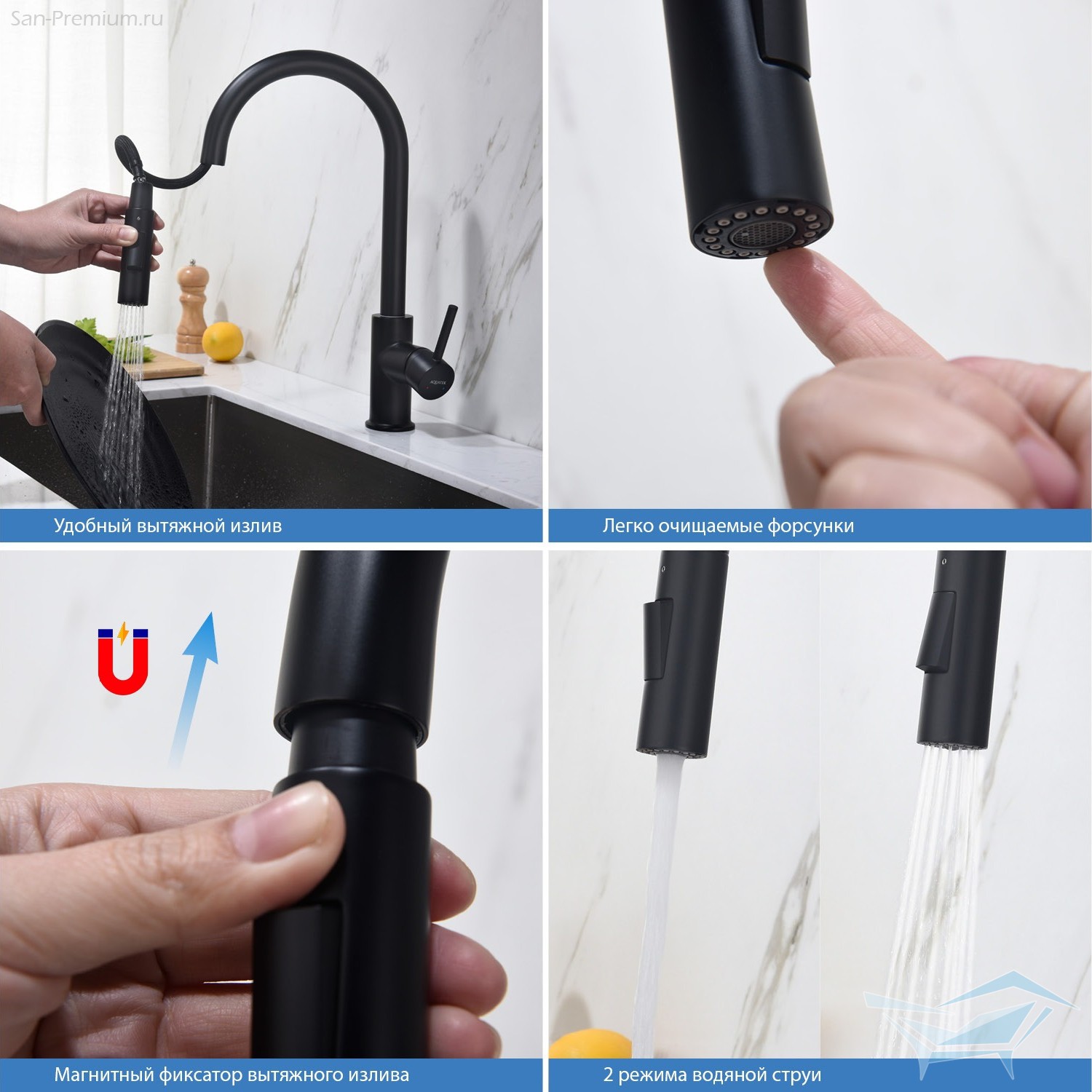 Смеситель для кухни Aquatek Европа, выдвижной излив 2jet, чёрный матовый