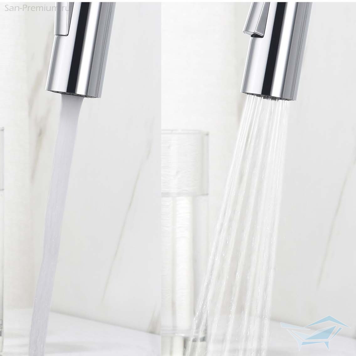 Первый режим обеспечивает кристально чистую струю, практически без добавления воздуха. Этот режим особенно удобен в повседневных кухонных делах, например, для быстрого наполнения больших кастрюль или мисок, минимизируя разбрызгивание.