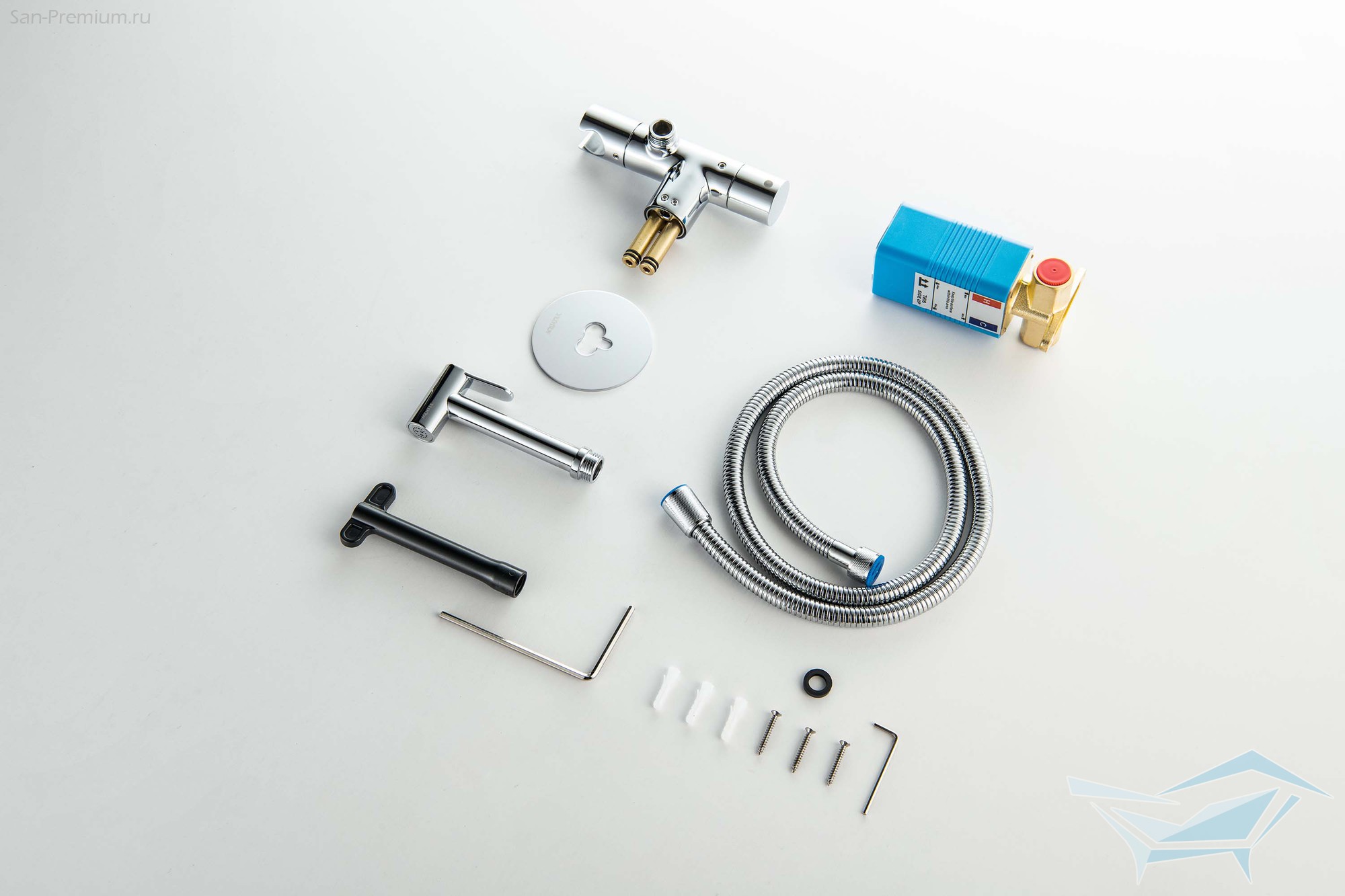 • Душевой гарнитур: гигиеническая лейка, шланг, шланговое подсоединение с держателем