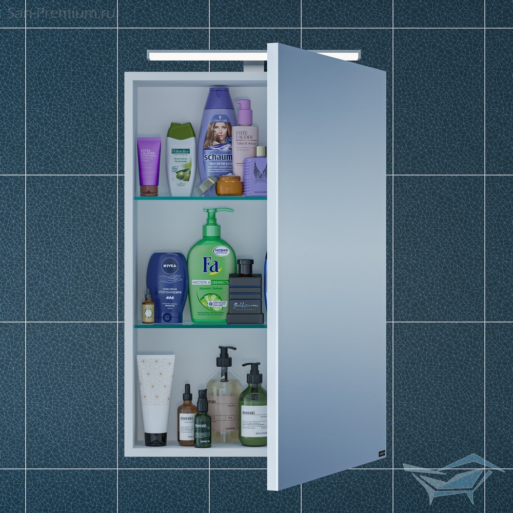 - Комплектация: петли плавного закрывания - 1 шт., стеклянные полки - 2 шт., светильник, розетка/выключатель - 1 шт.