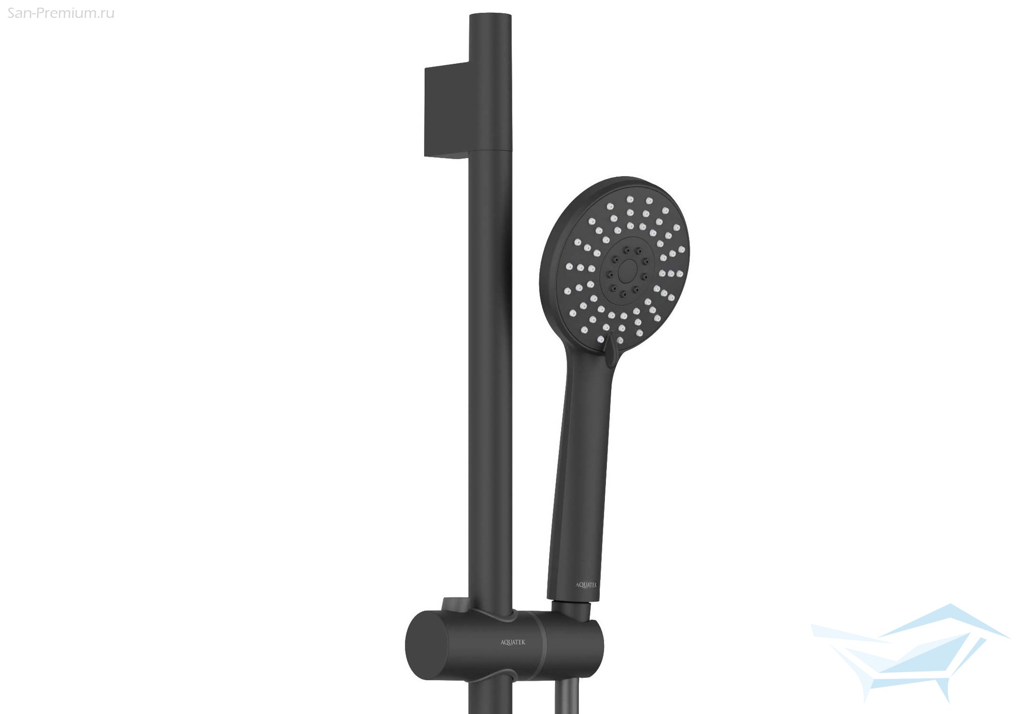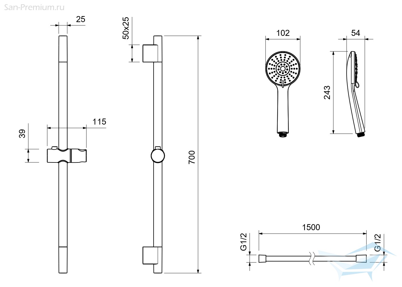 • Душевой гарнитур: стойка для душа, лейка, держатель лейки, шланг