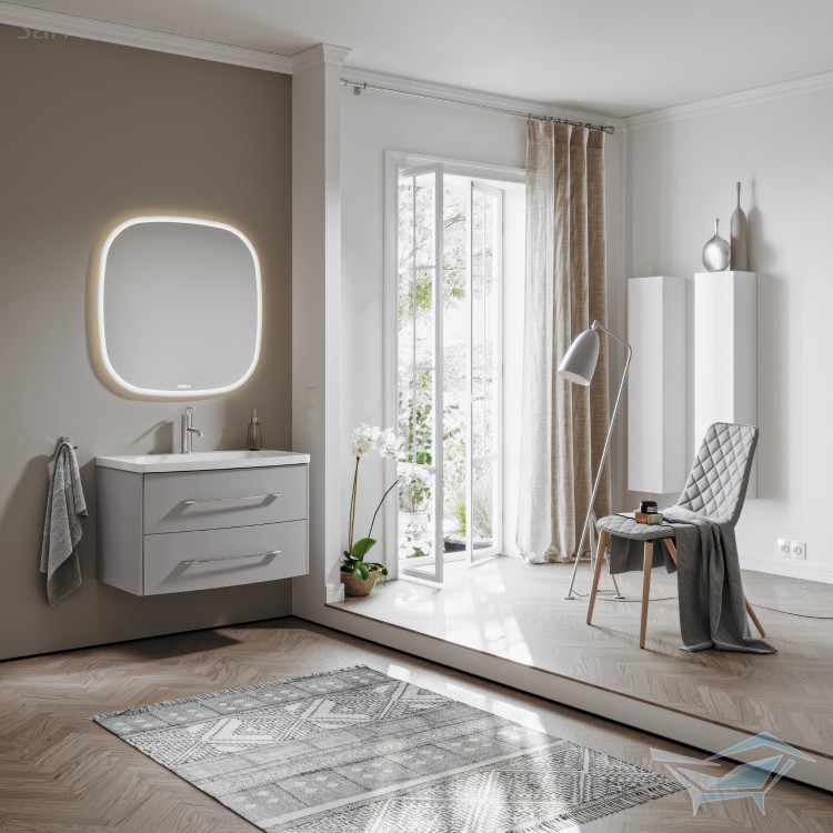 - Основным предметом коллекции Neringa является подвесная тумба шириной 80 см с изогнутым фасадом.