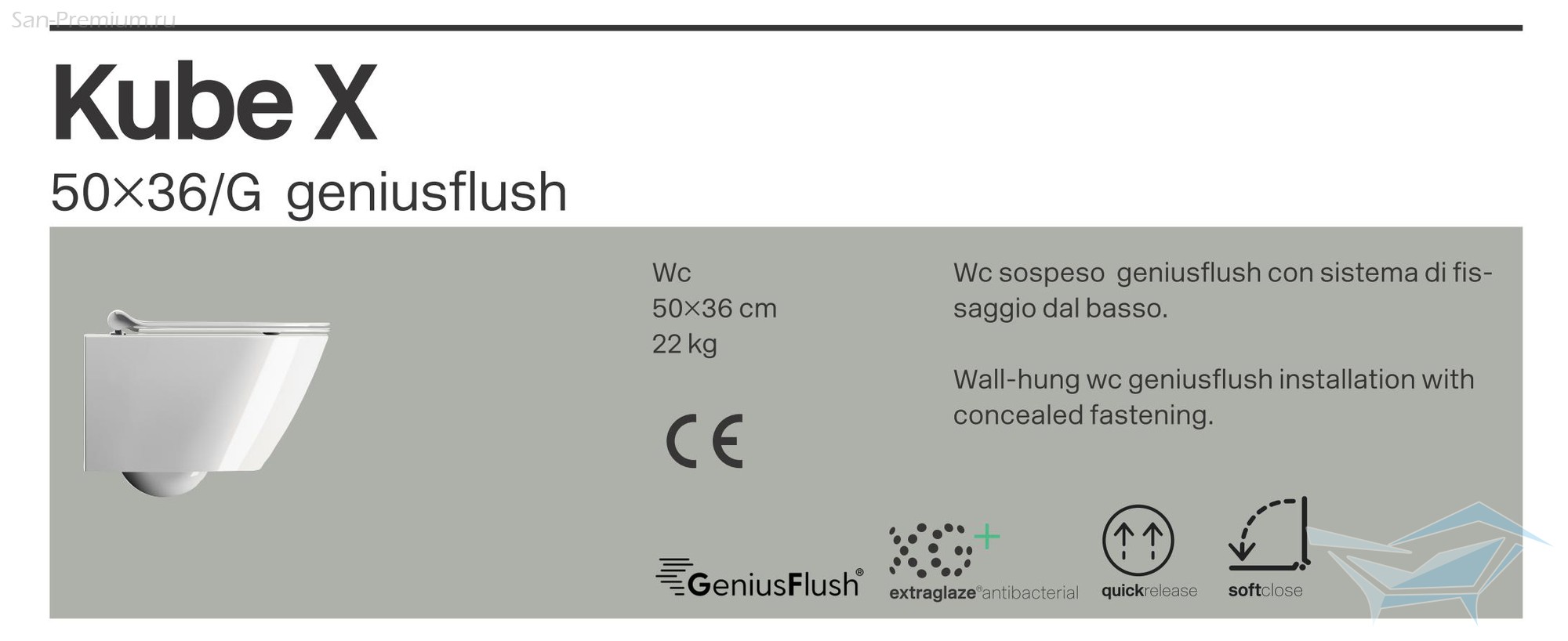 Подвесной унитаз GSI Kube X без ободка Rimless GeniusFlush с антибактериальной поверхностью