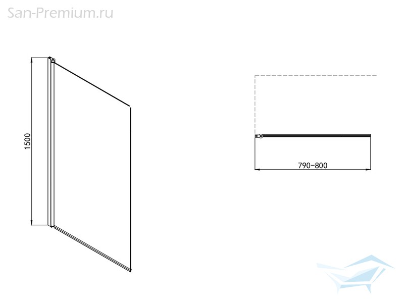Шторка на ванну Aquatek 800x1500, одноэлементная, поворотная, стекло прозрачное рифлёное 6мм, профиль чёрный