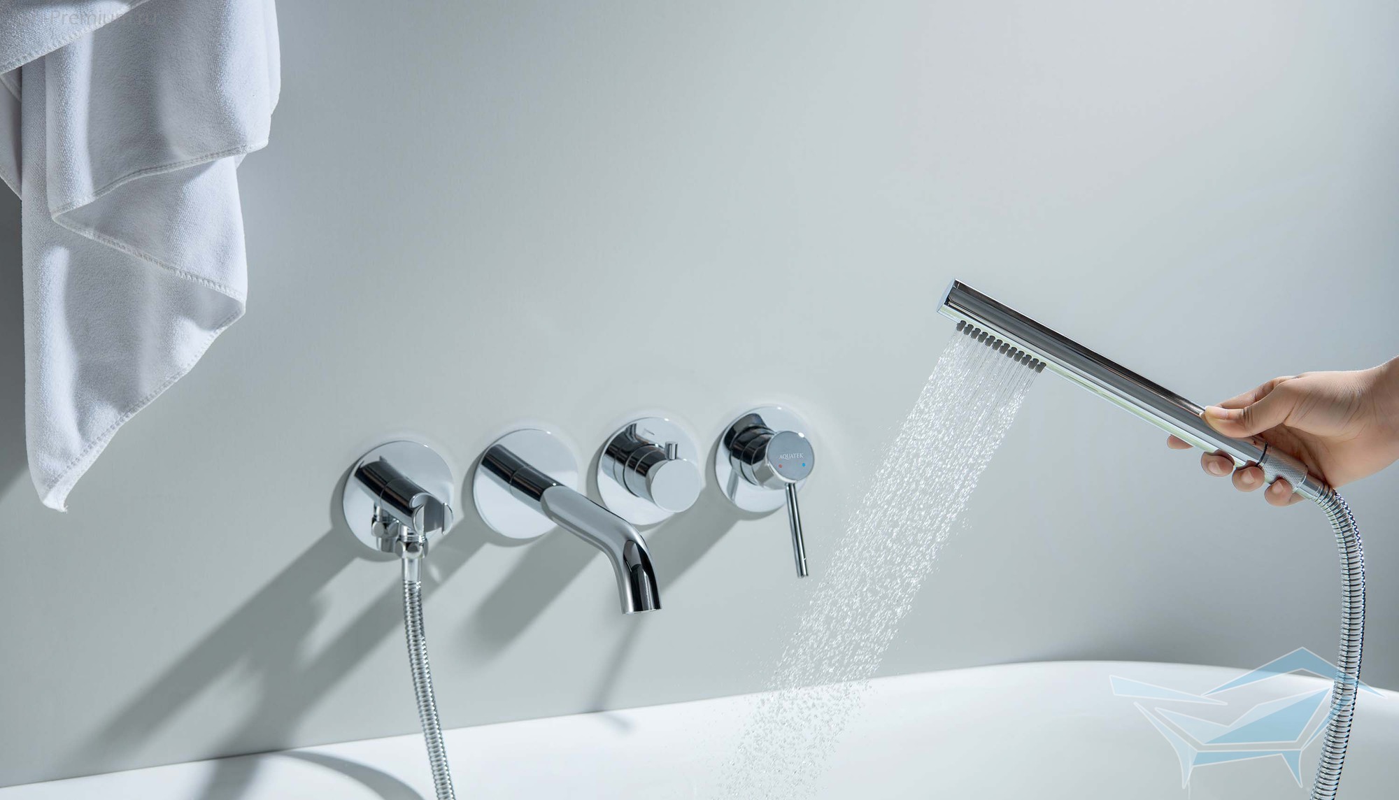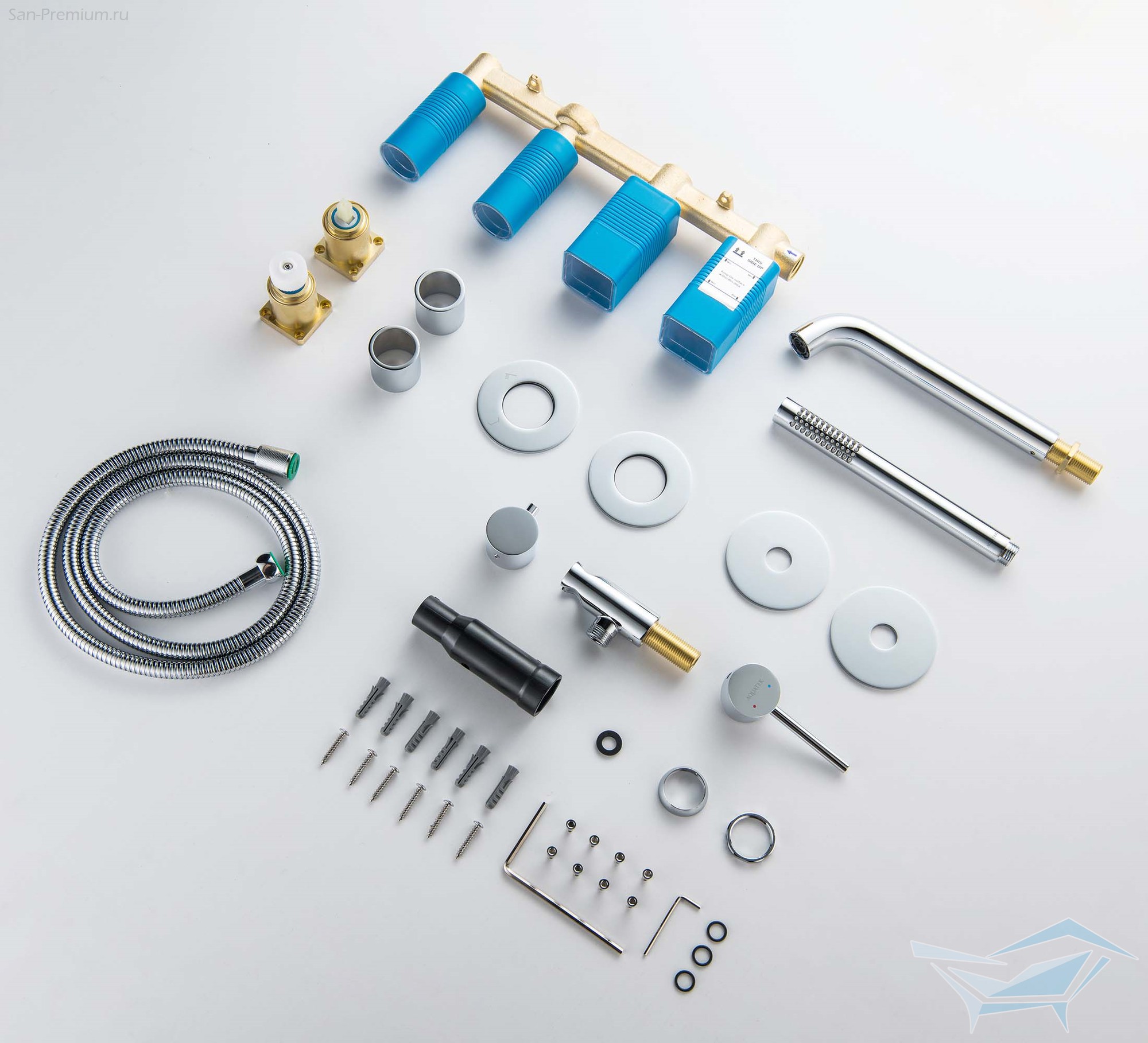 - Комплектация: смеситель, монтажный комплект, декоративные отражатели, душевая лейка, душевой шланг, держатель лейки
