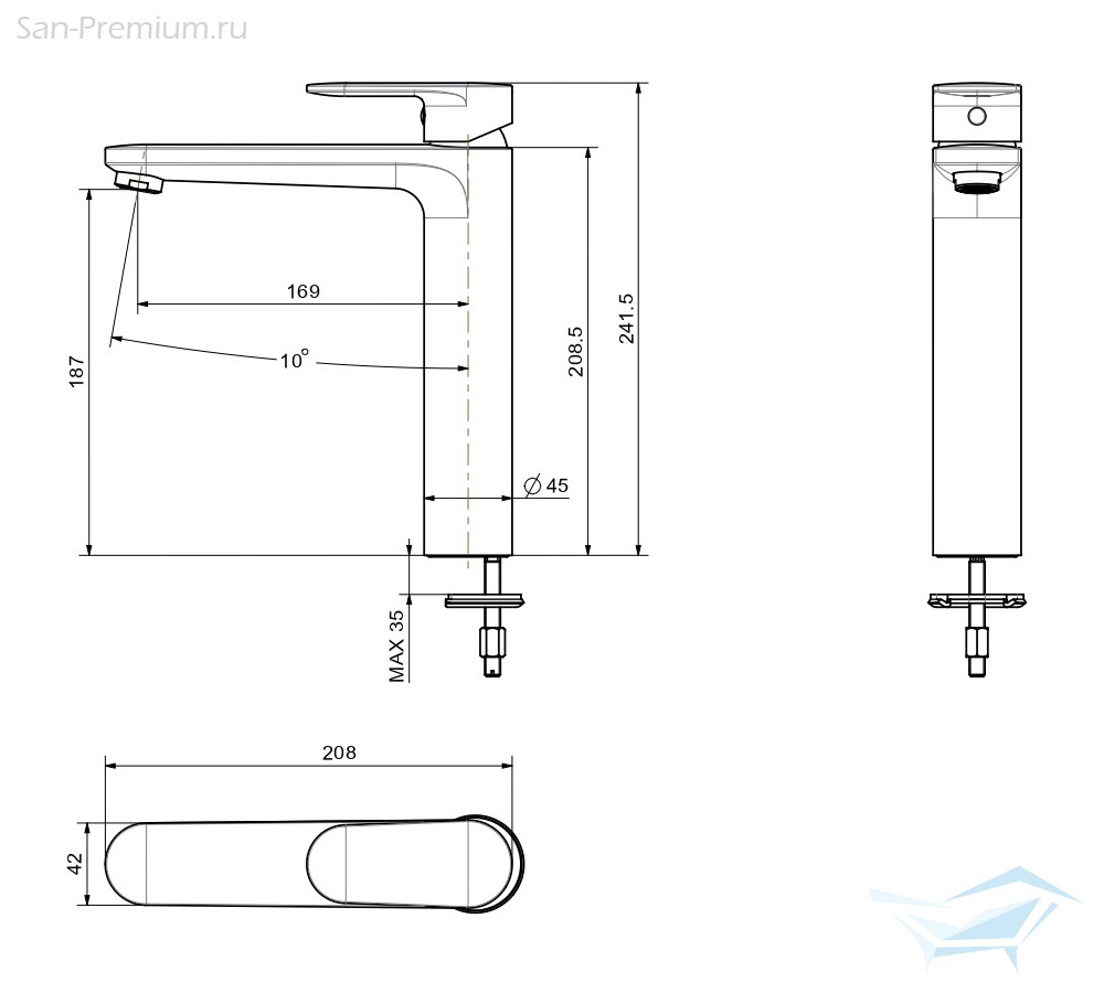 - Длина излива: 169 мм