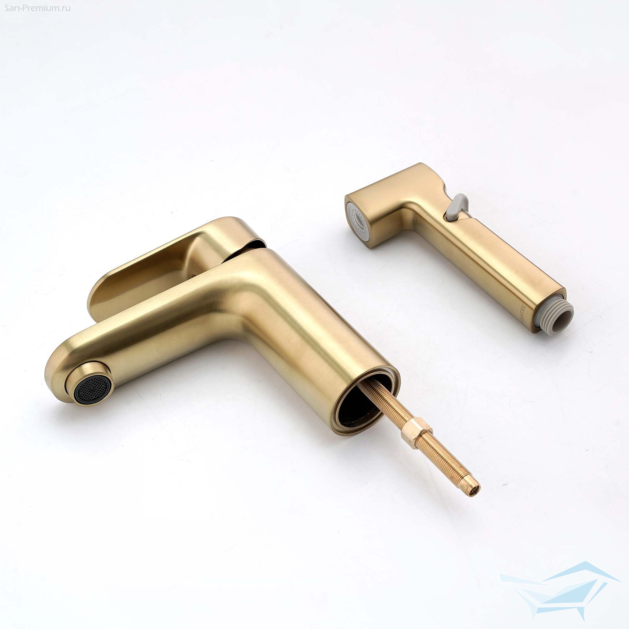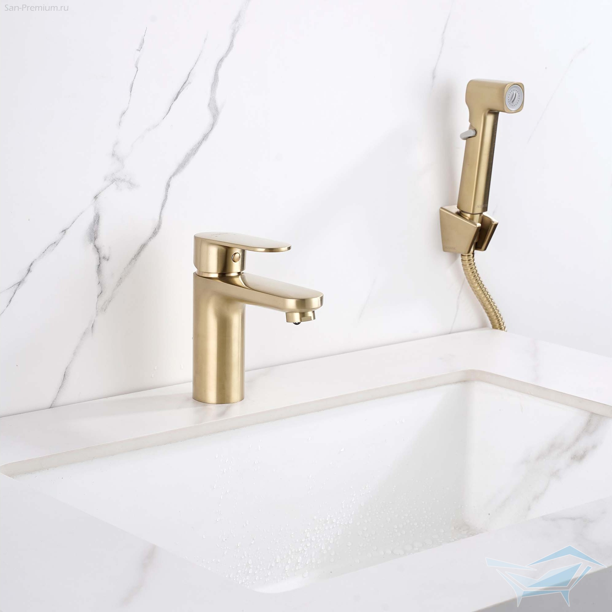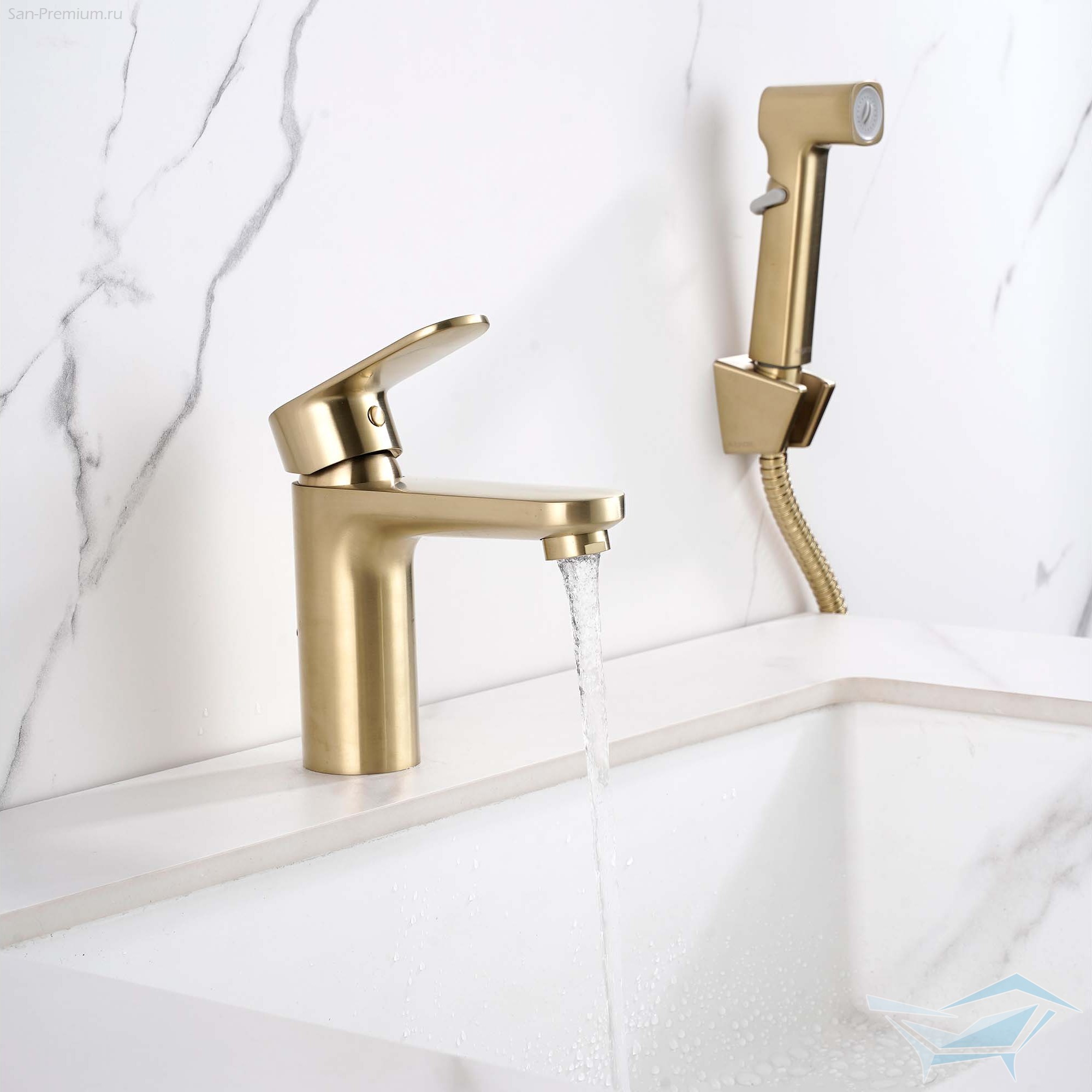 Смеситель для раковины Aquatek Ника 90, без донного клапана, с гигиеническим душем, шлифованное золото