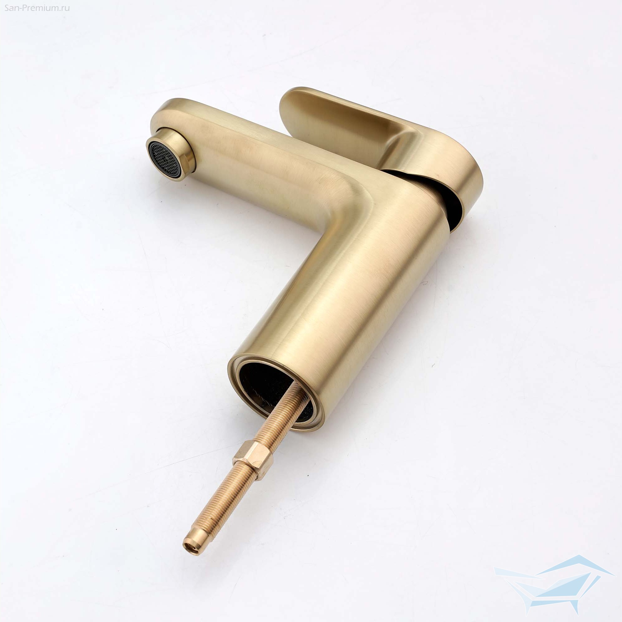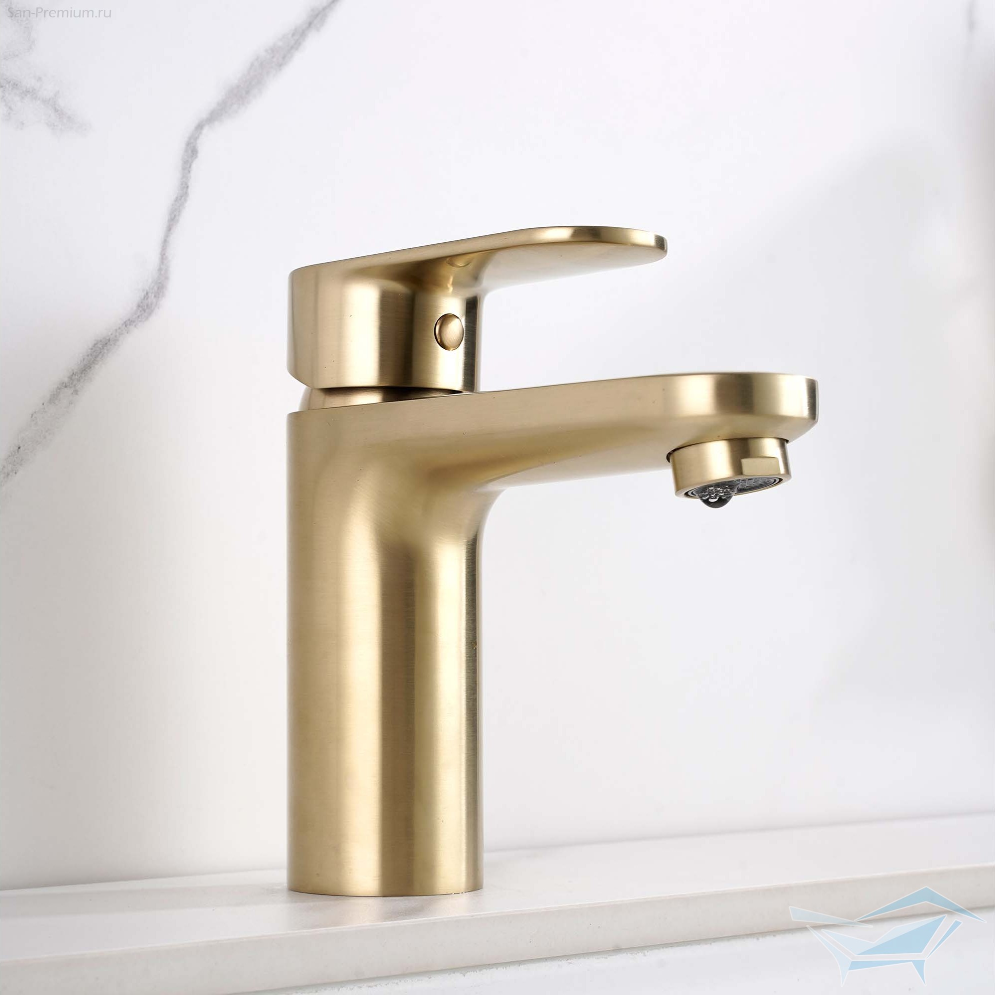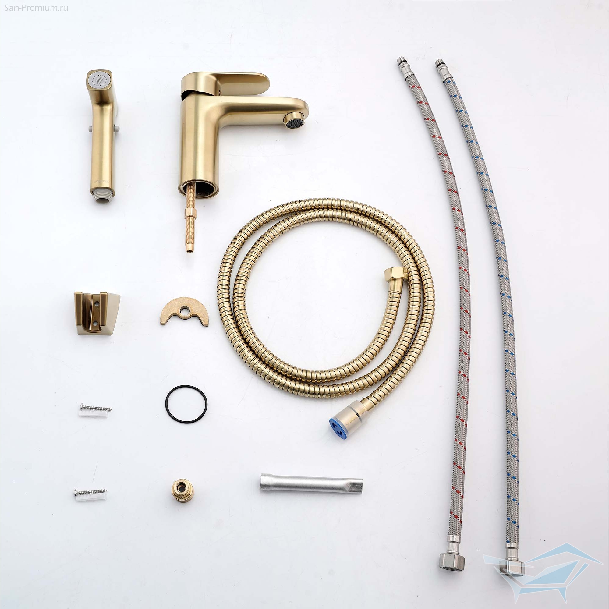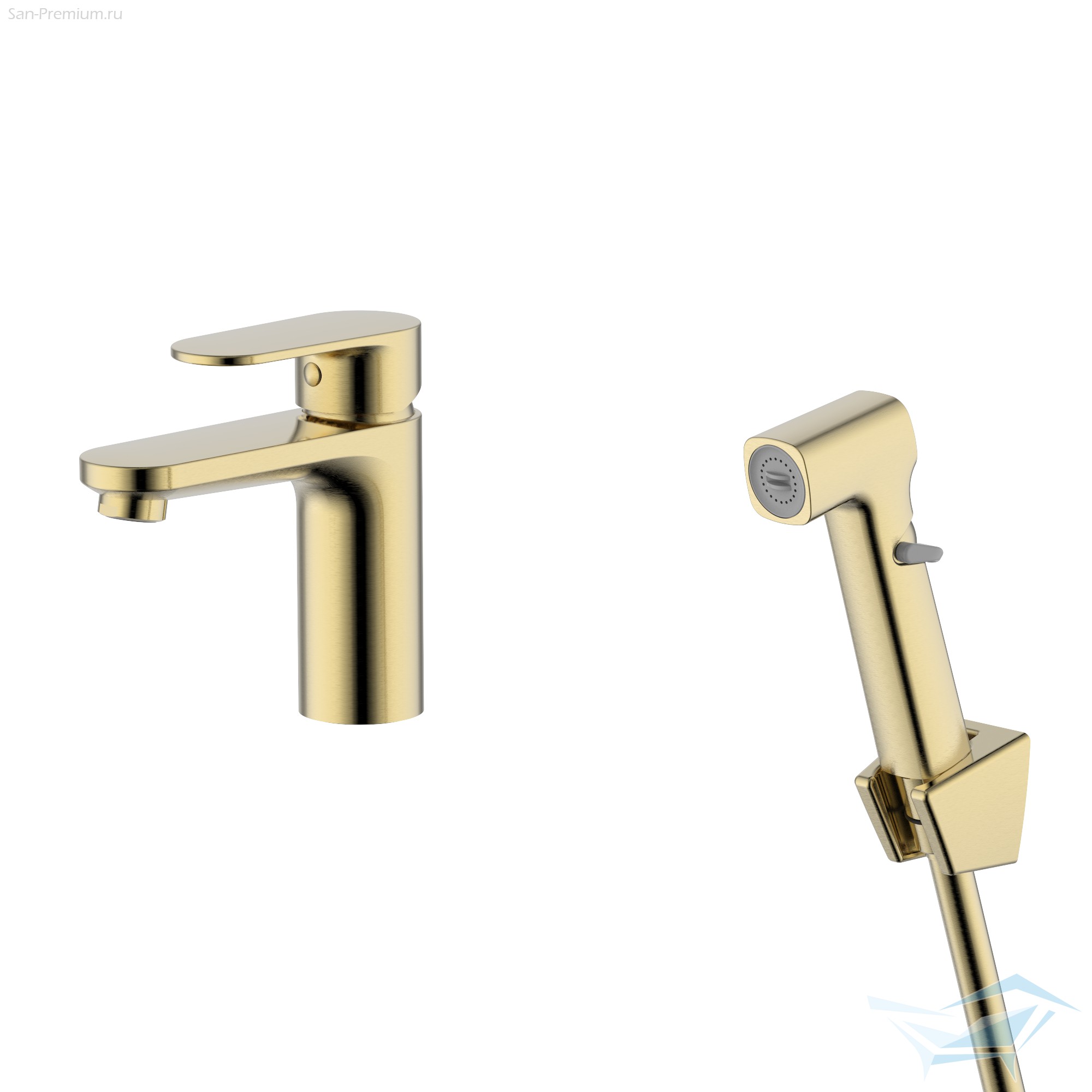 Смеситель для раковины Aquatek Ника 90, без донного клапана, с гигиеническим душем, шлифованное золото