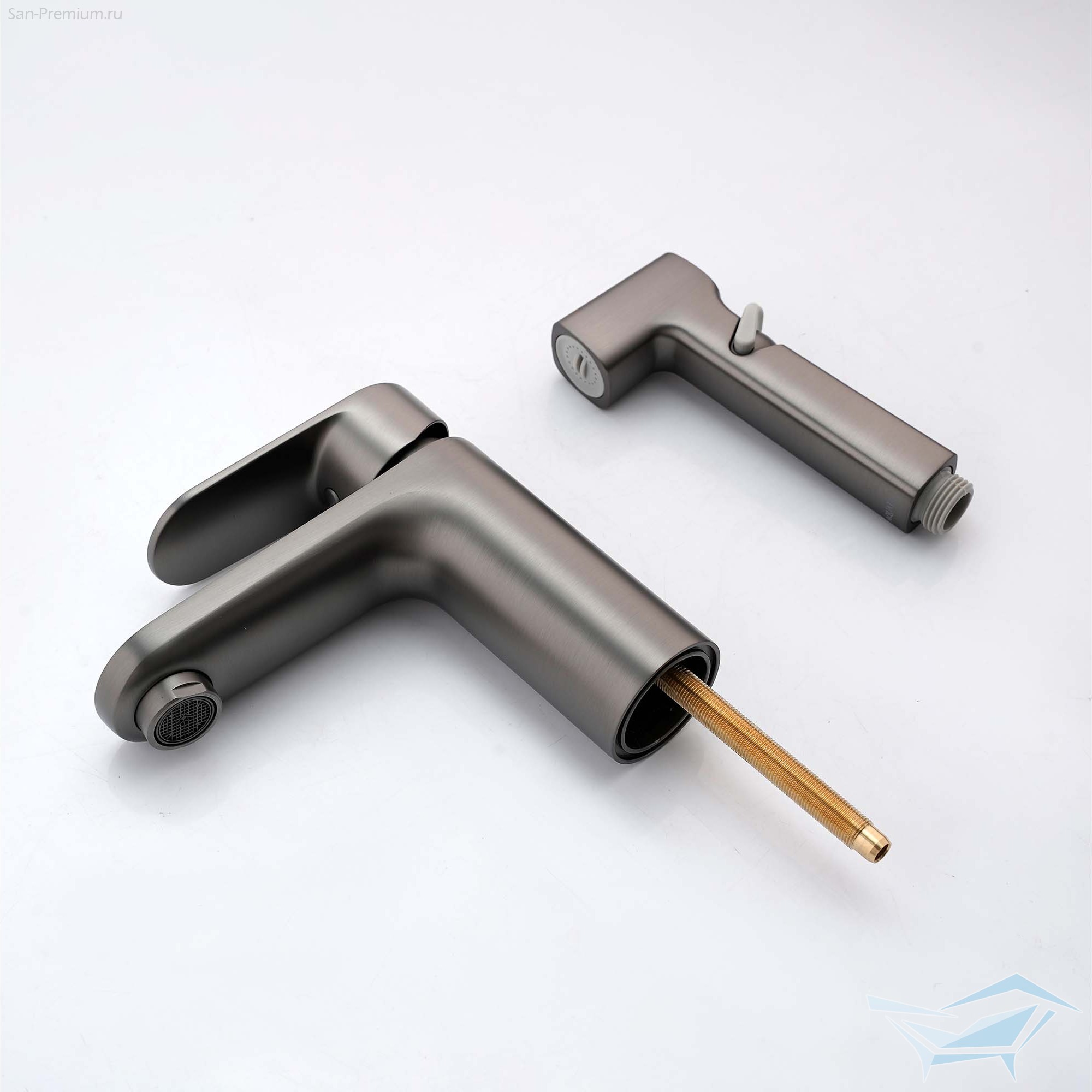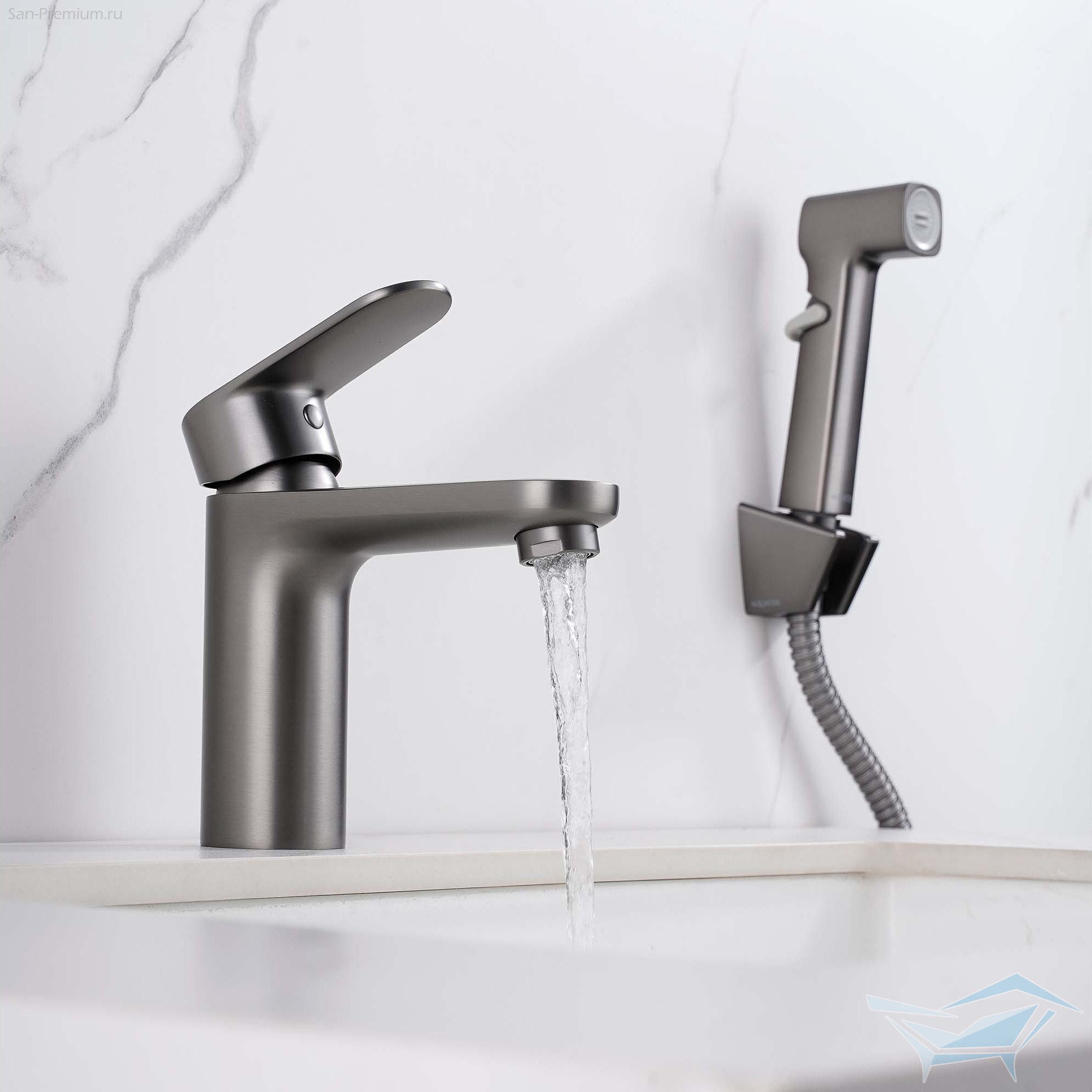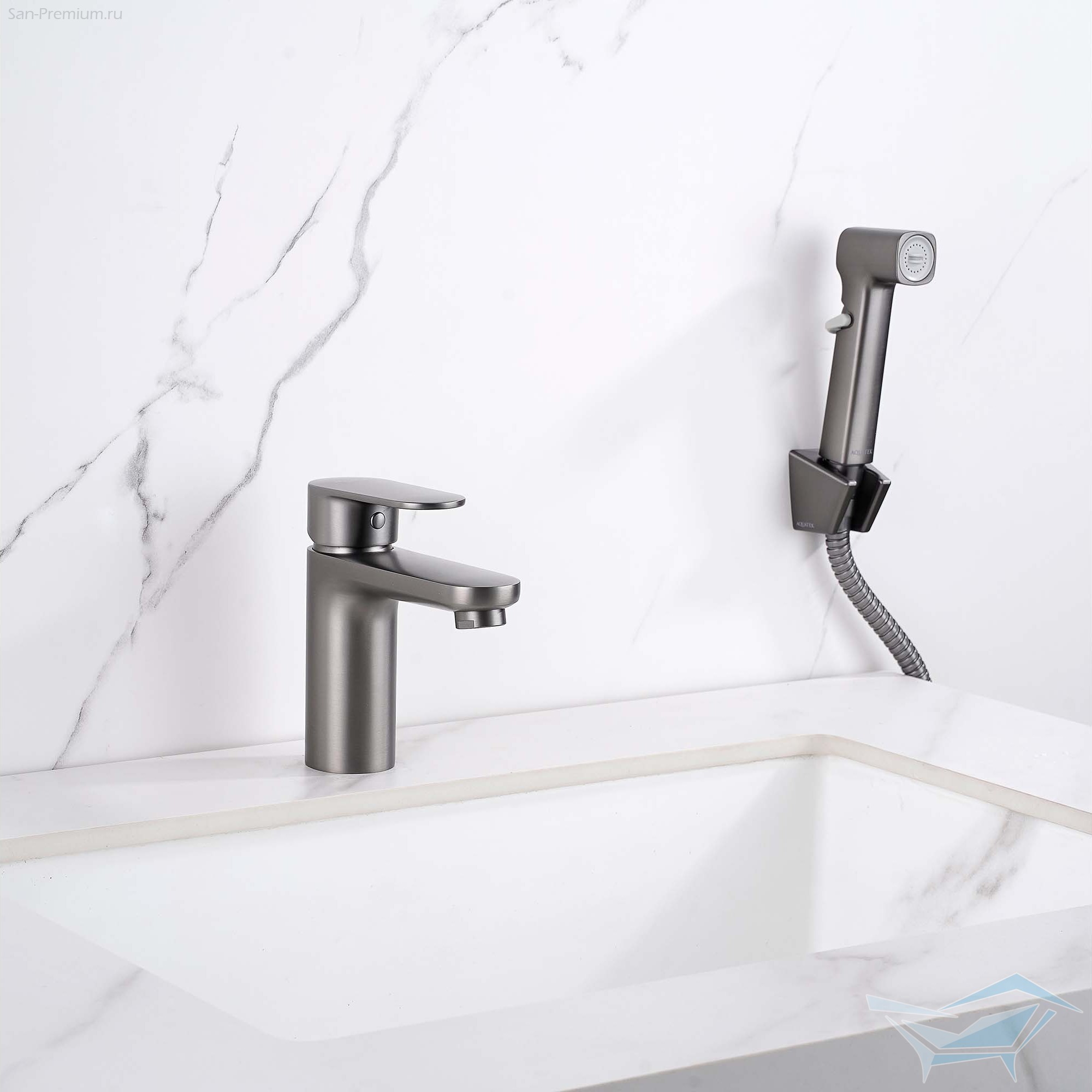 Смеситель для раковины Aquatek Ника 90, без донного клапана, с гигиеническим душем, оружейная сталь