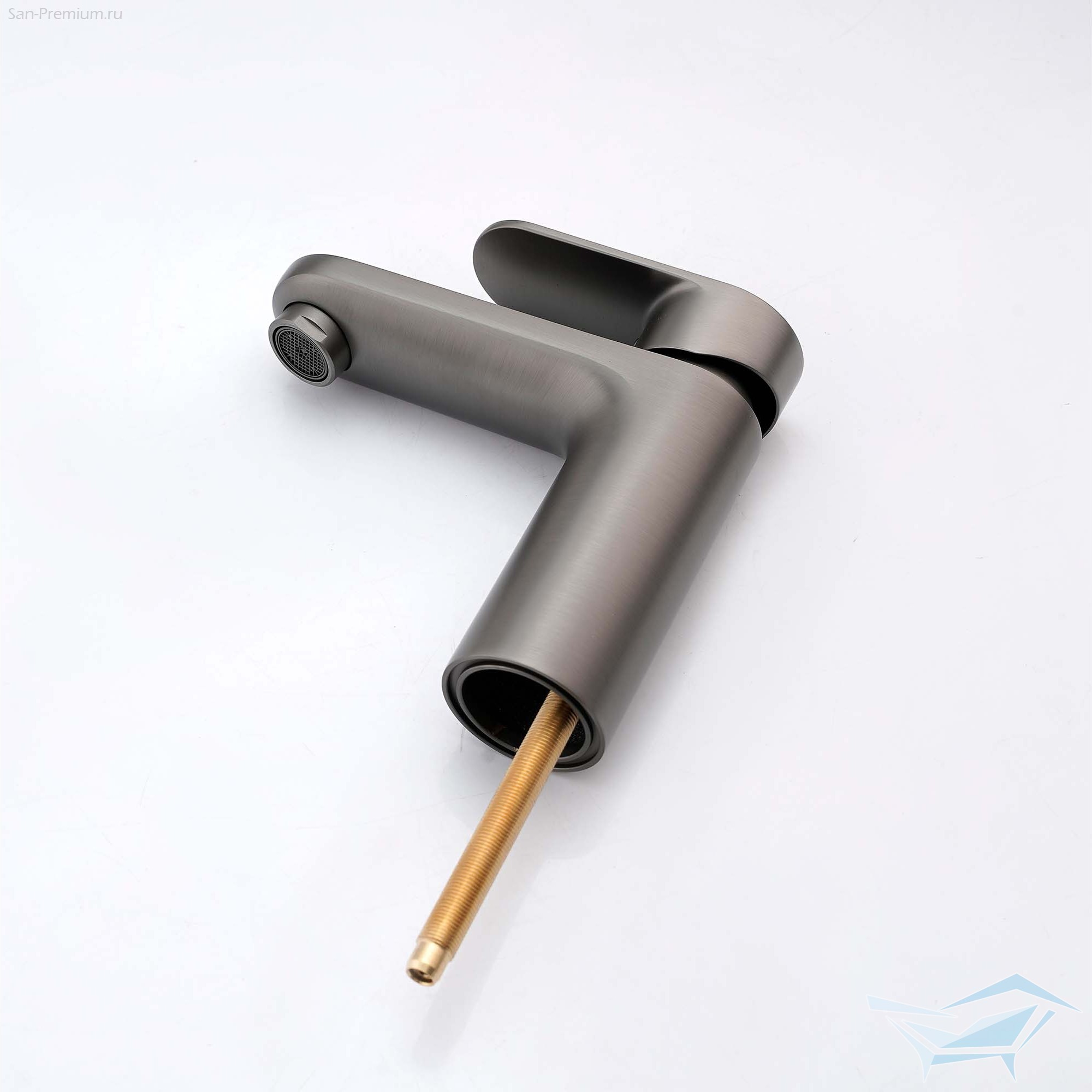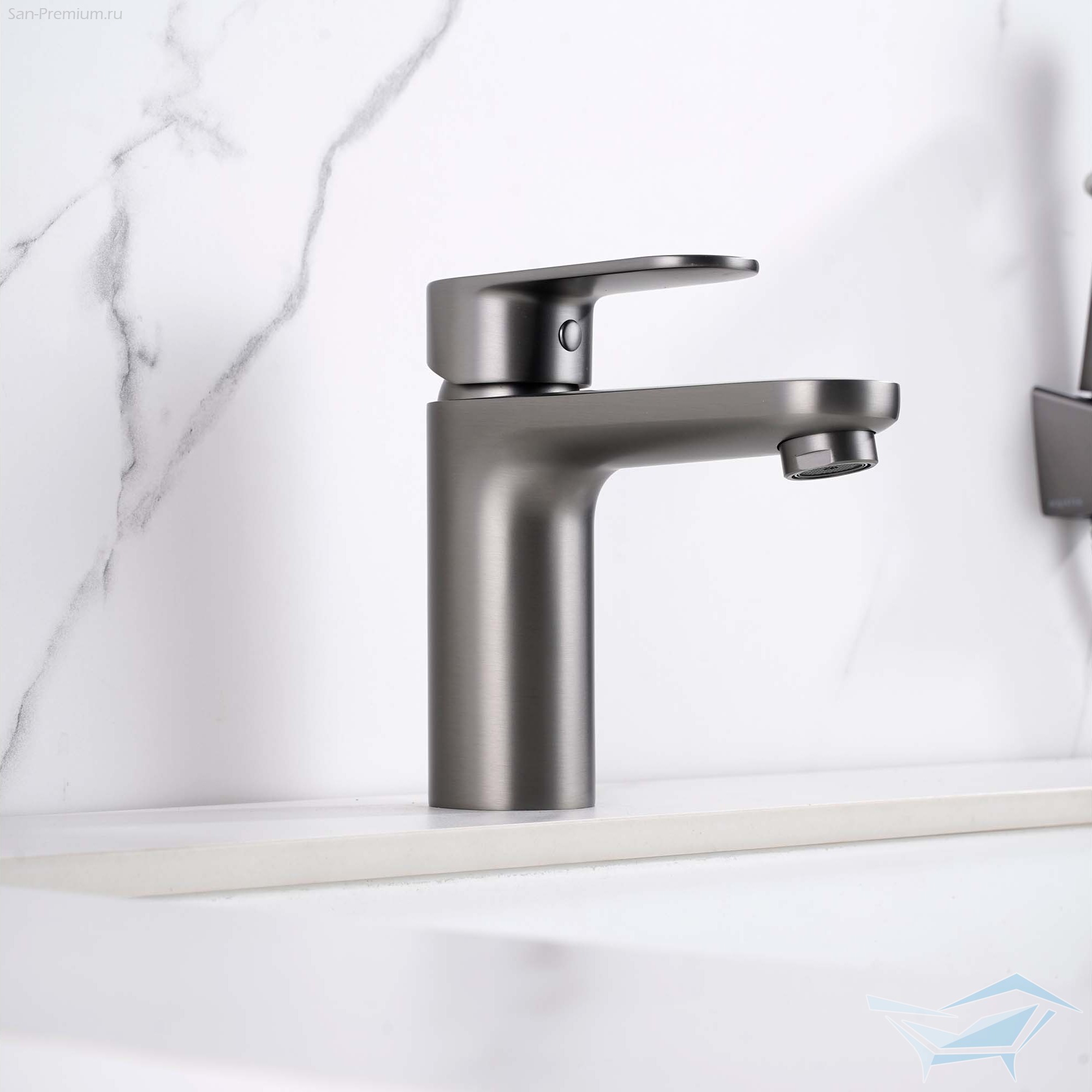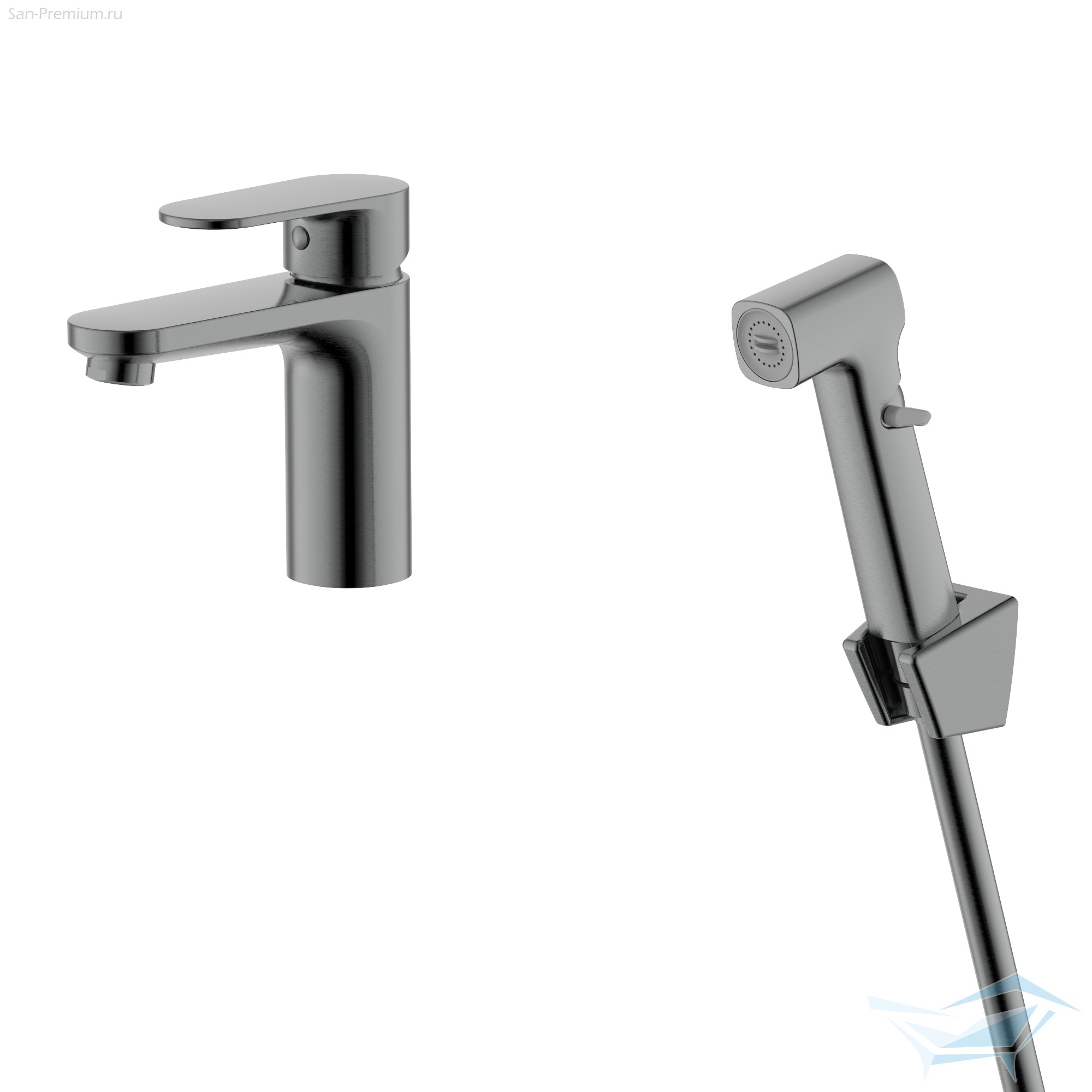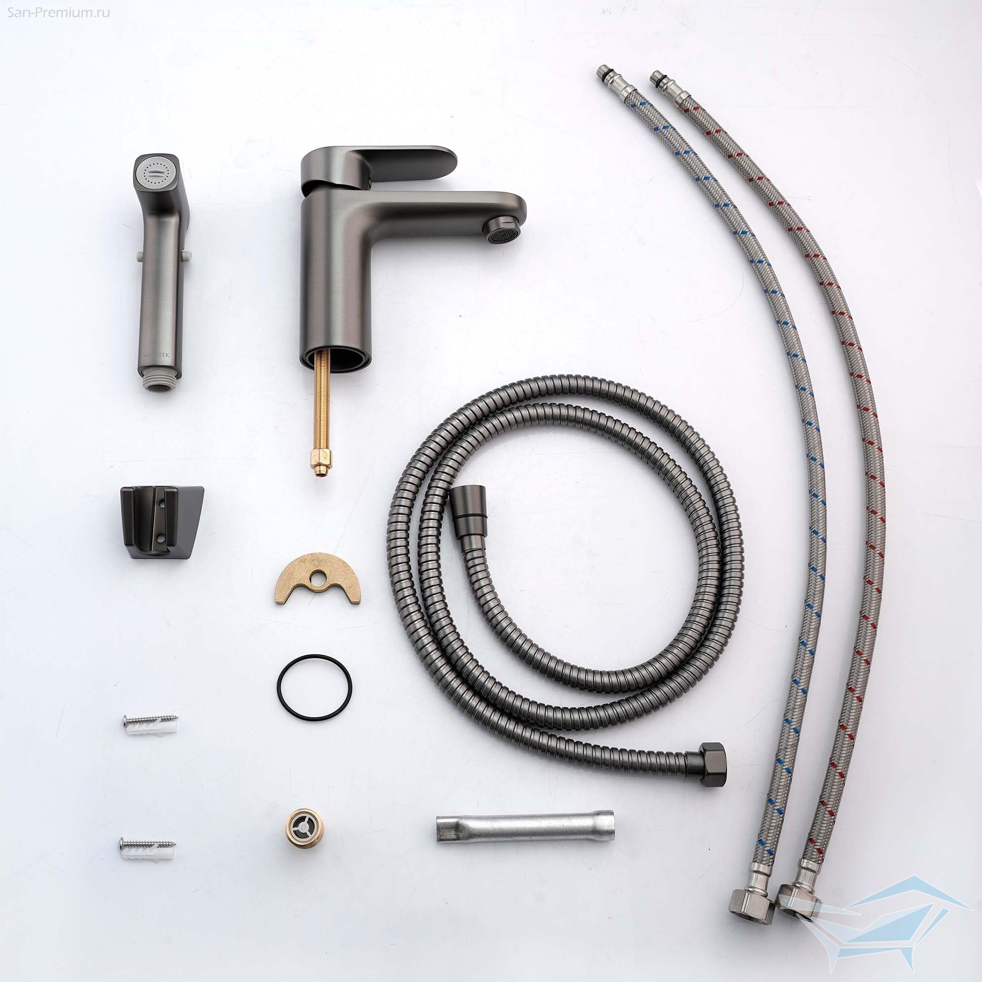 Смеситель для раковины Aquatek Ника 90, без донного клапана, с гигиеническим душем, оружейная сталь