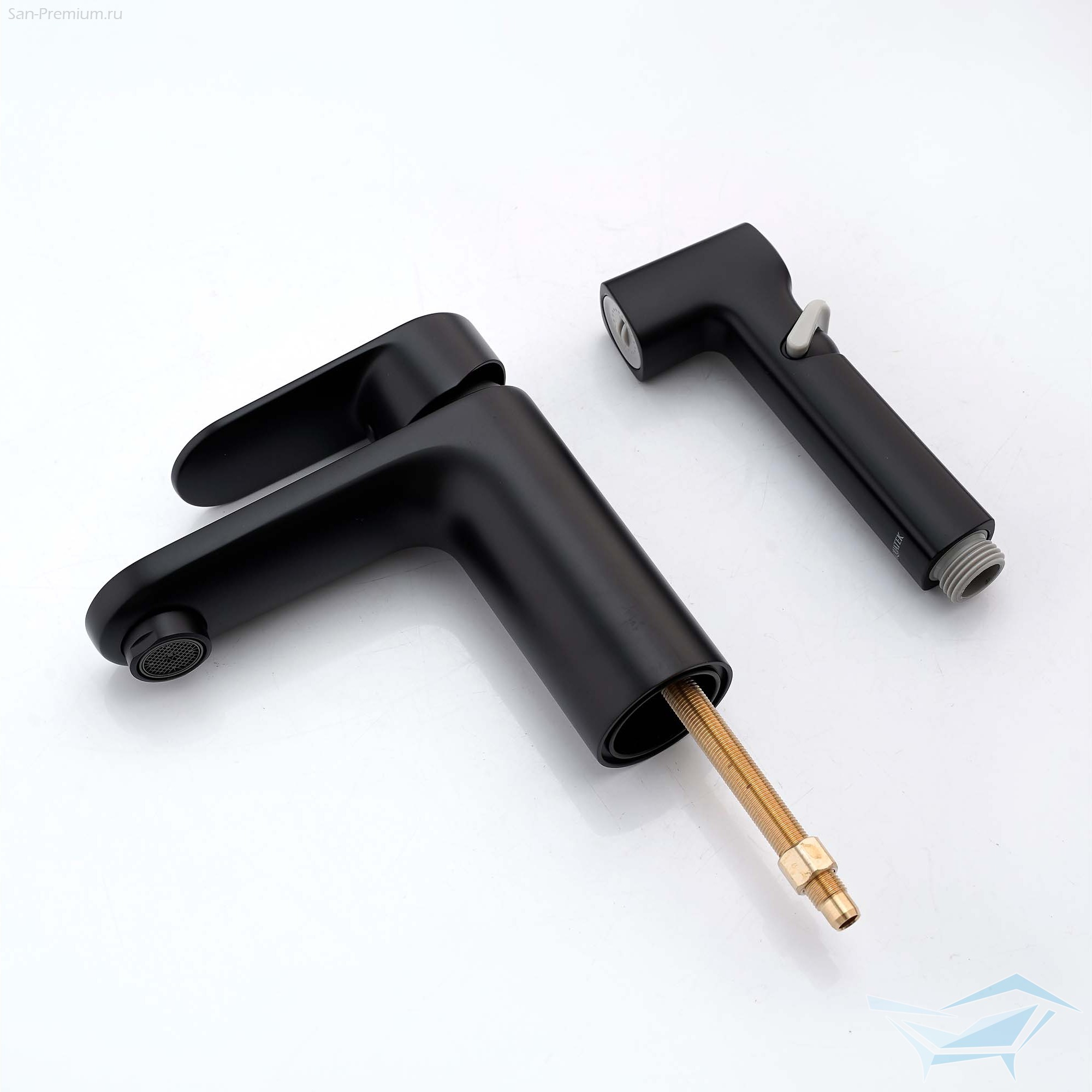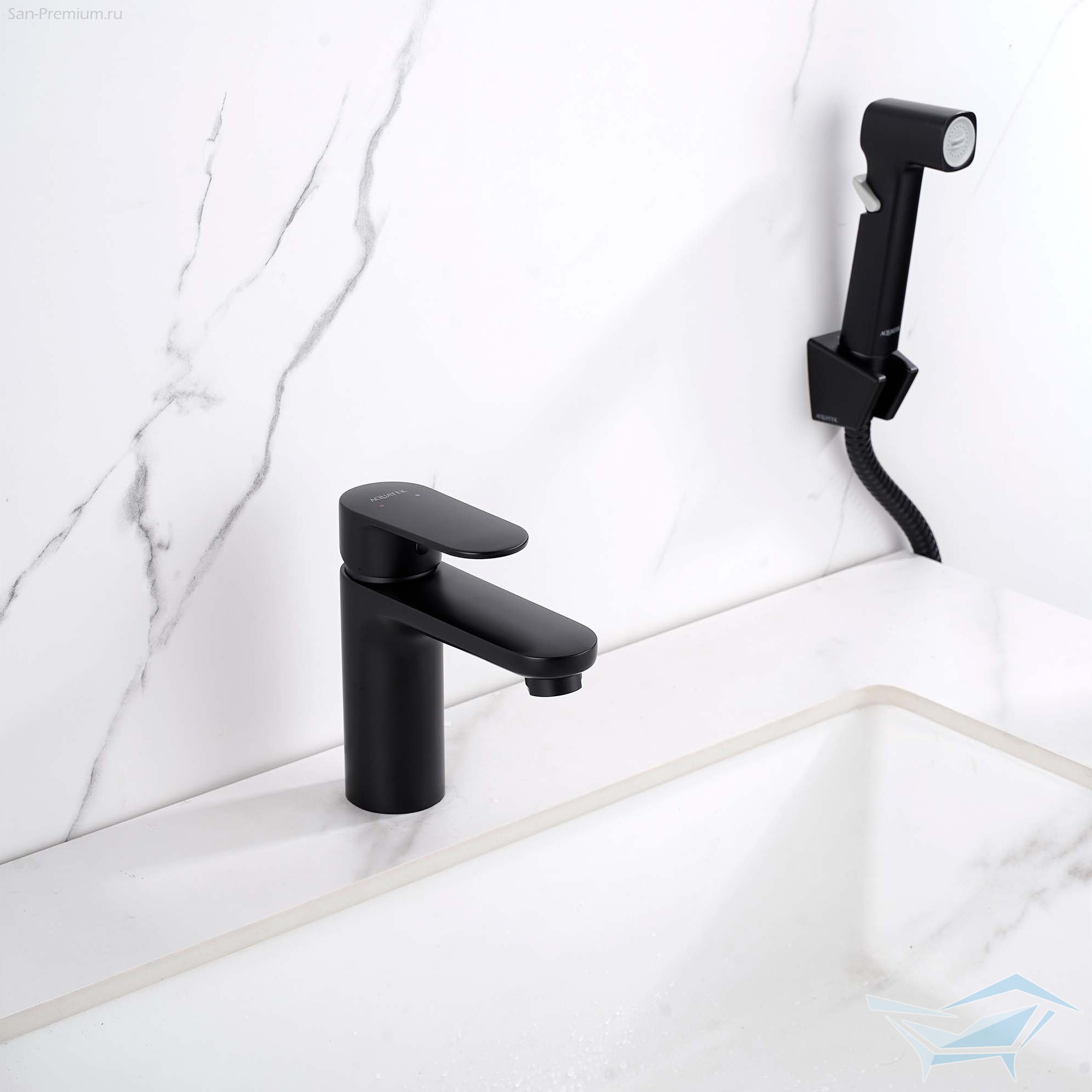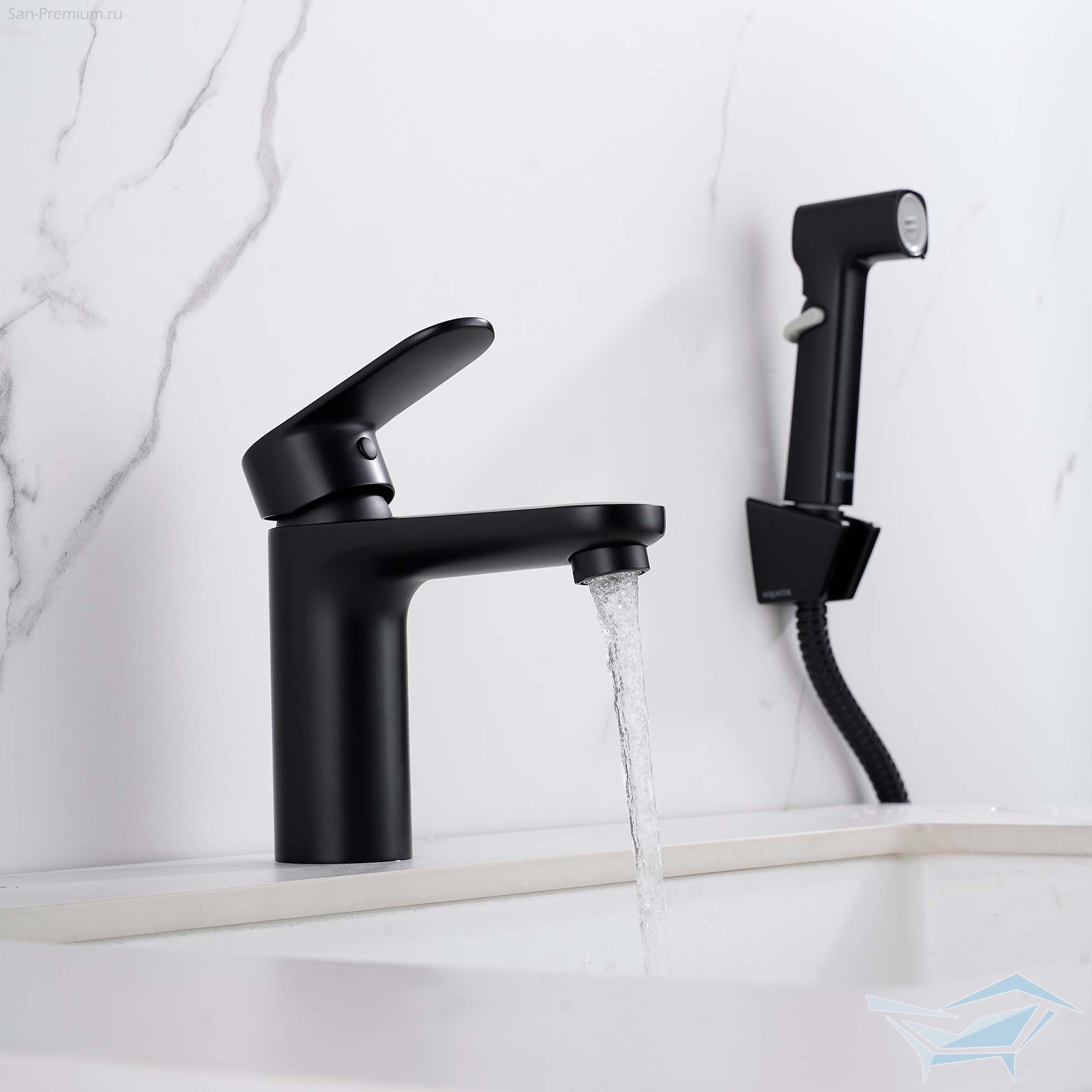 Смеситель для раковины Aquatek Ника 90, без донного клапана, с гигиеническим душем, матовый чёрный