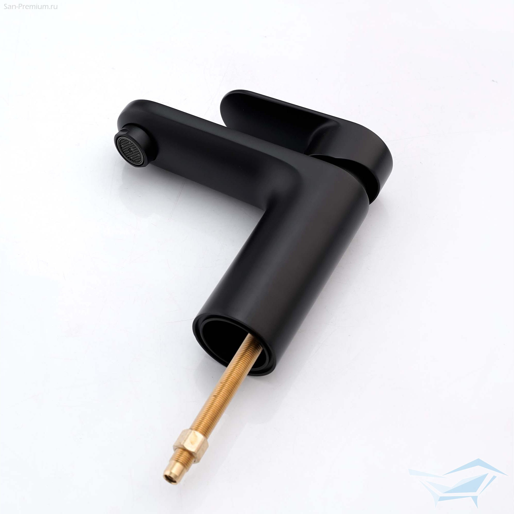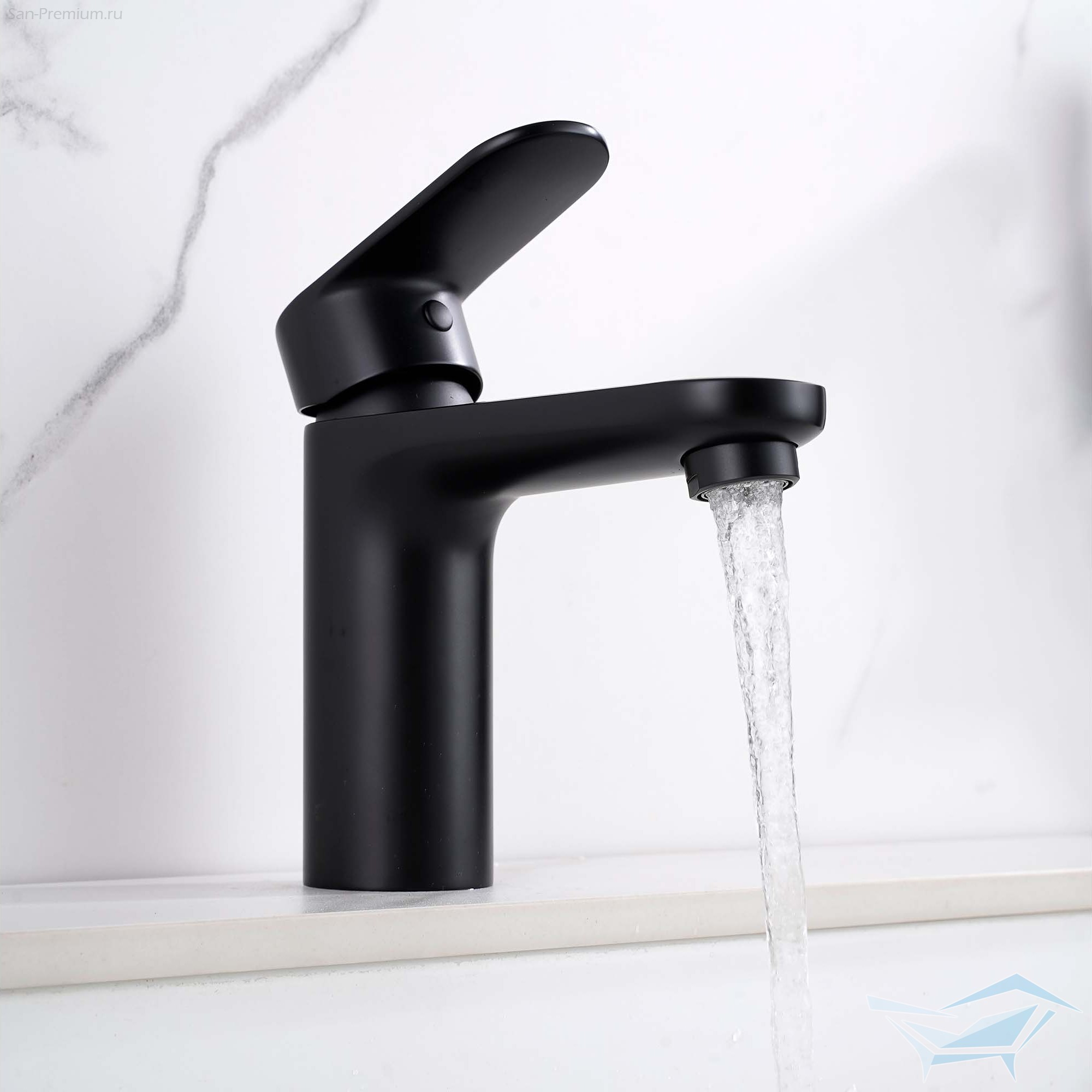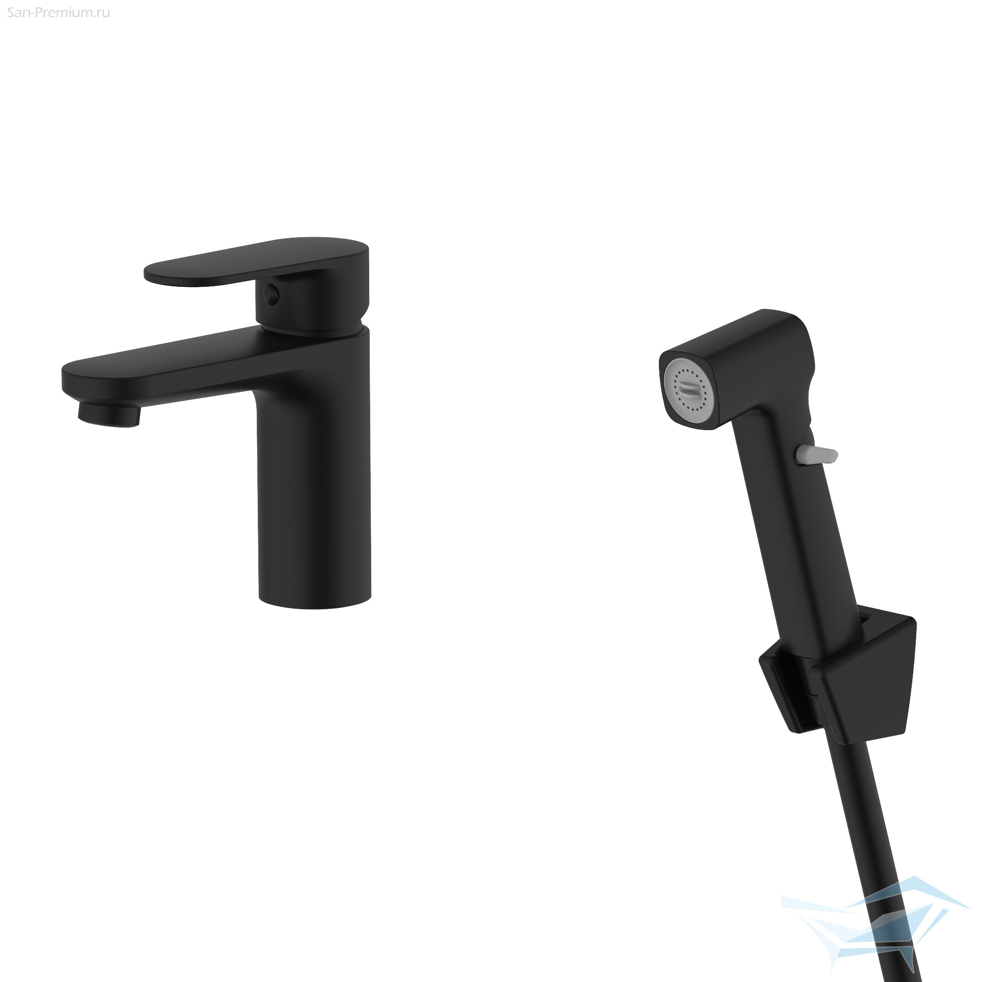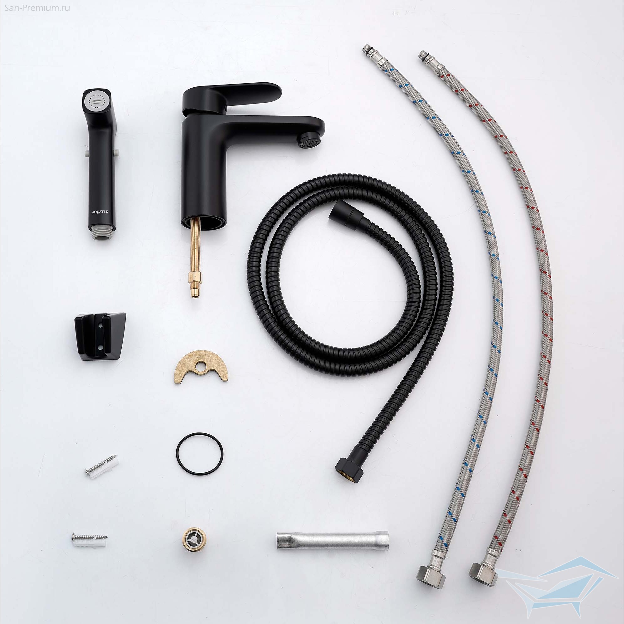 Смеситель для раковины Aquatek Ника 90, без донного клапана, с гигиеническим душем, матовый чёрный