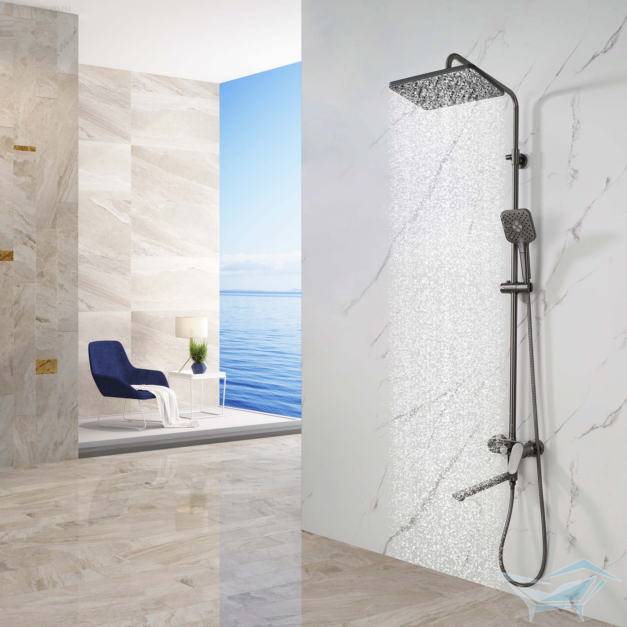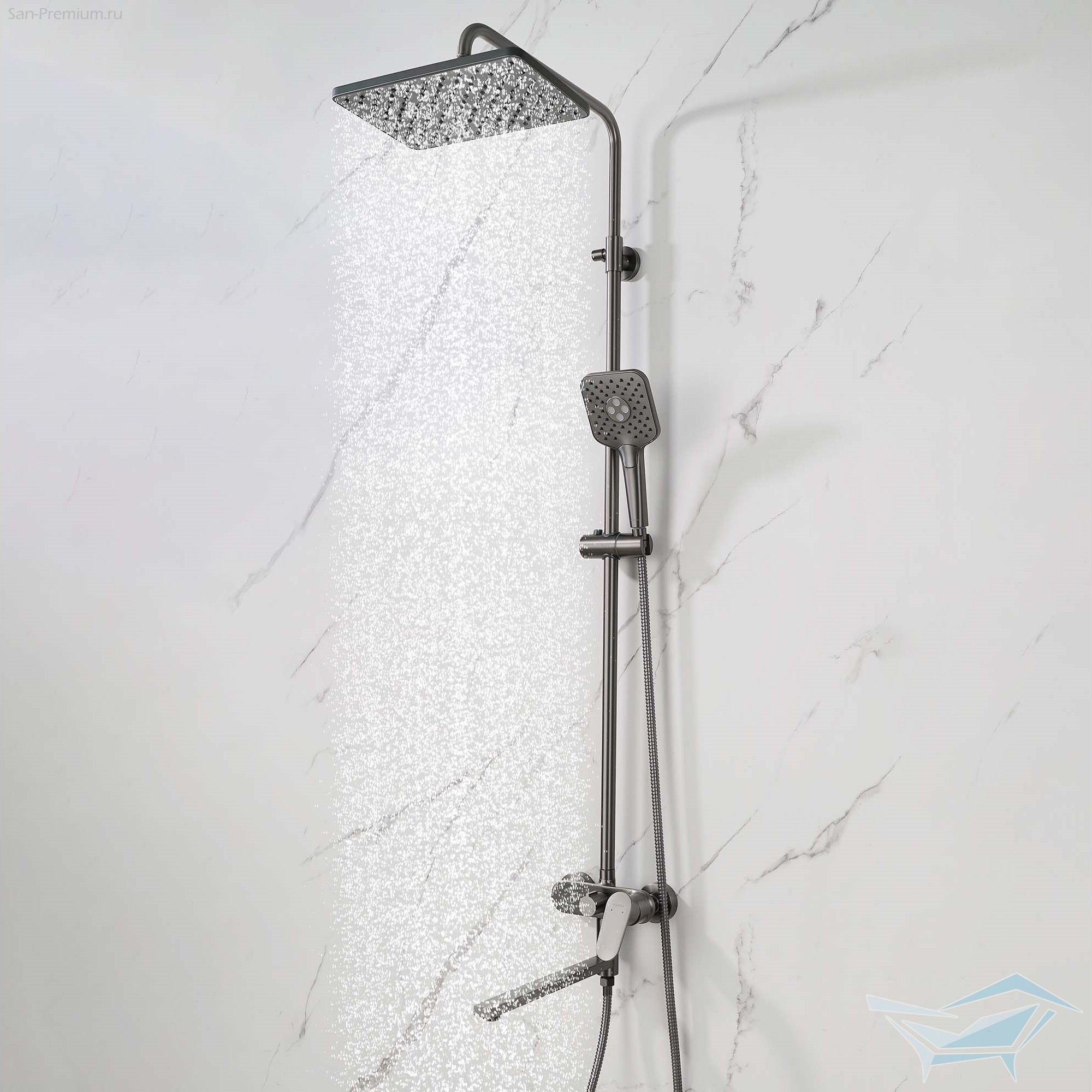 - Комплектация: держатель душевой лейки, излив, верхний душ, ручной душ, смеситель, штанга, шланг душевой