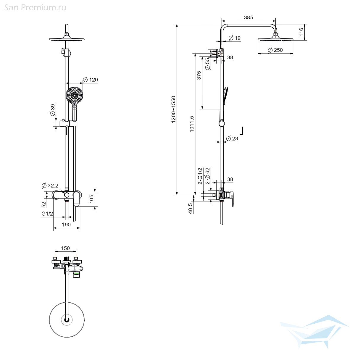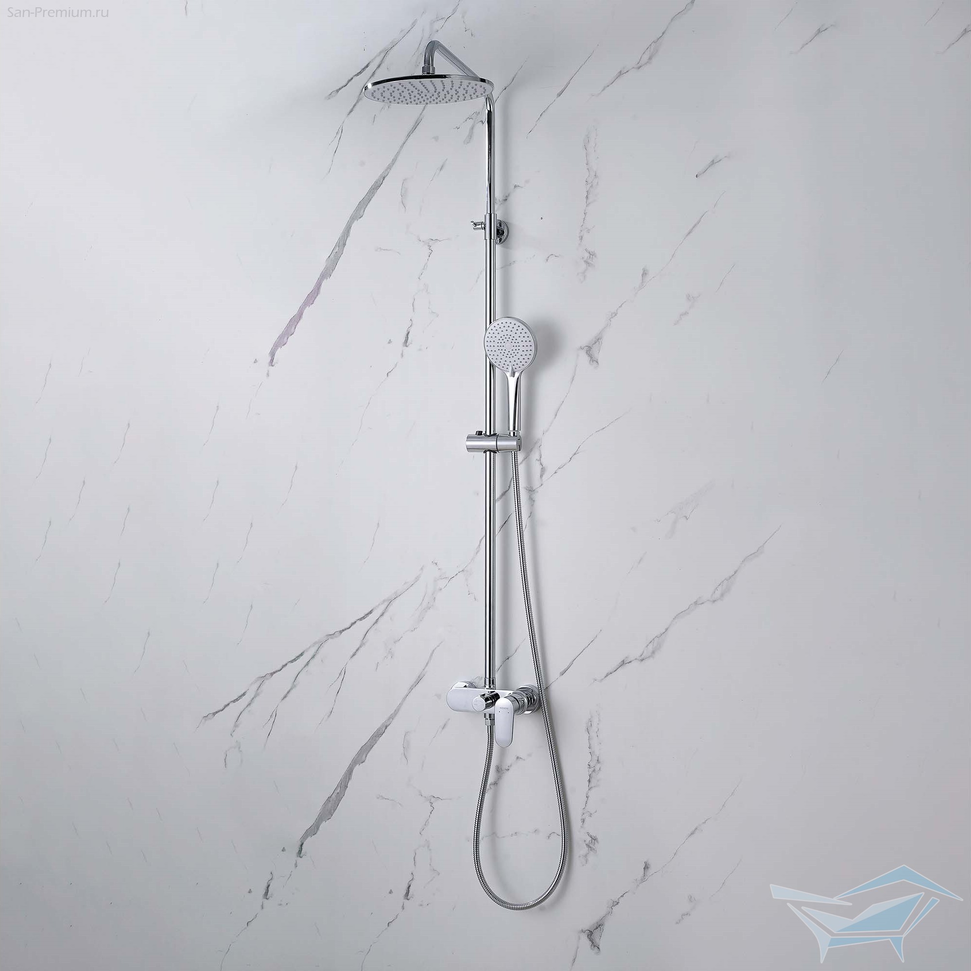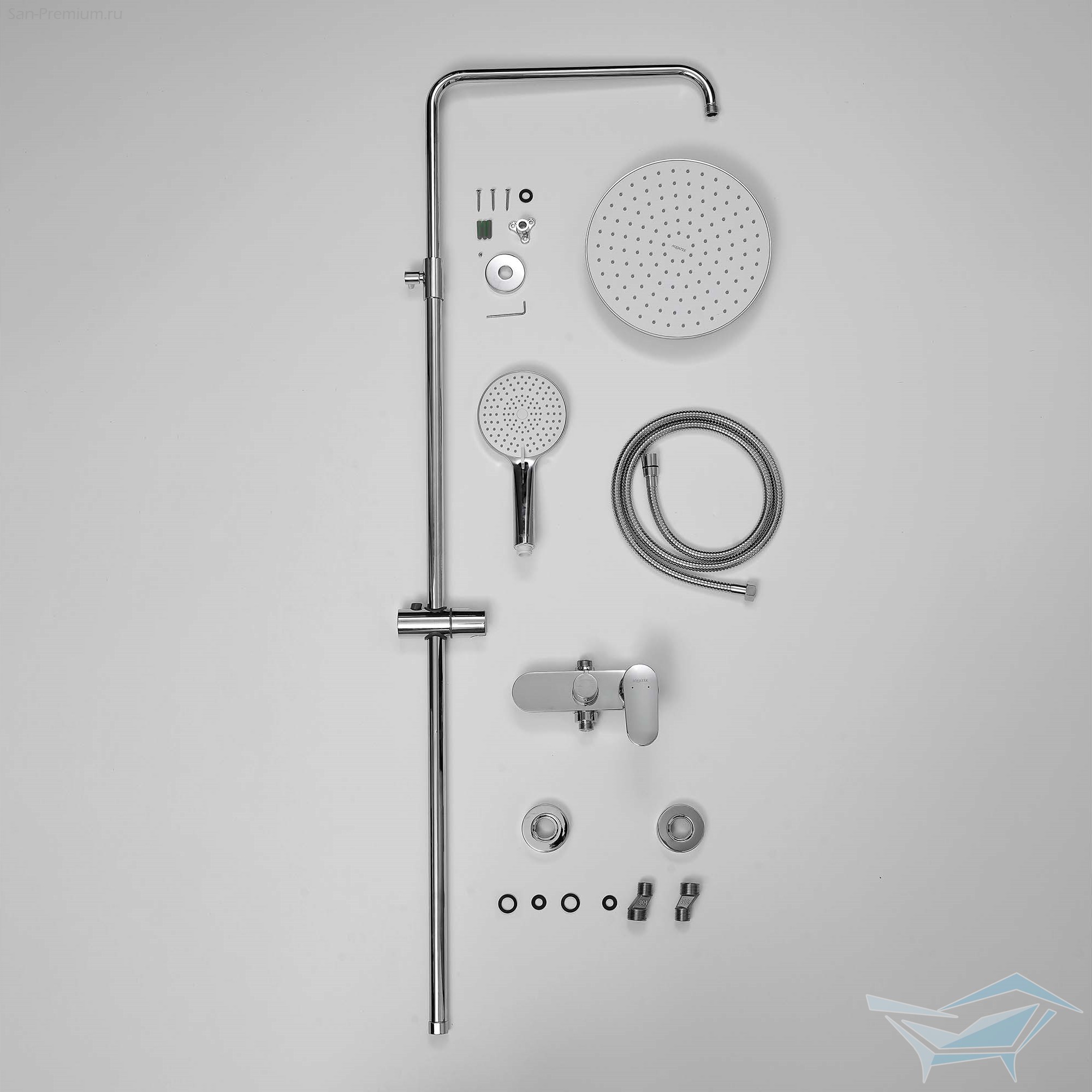 - Комплектация: держатель душевой лейки, верхний душ, ручной душ, смеситель, штанга, шланг душевой