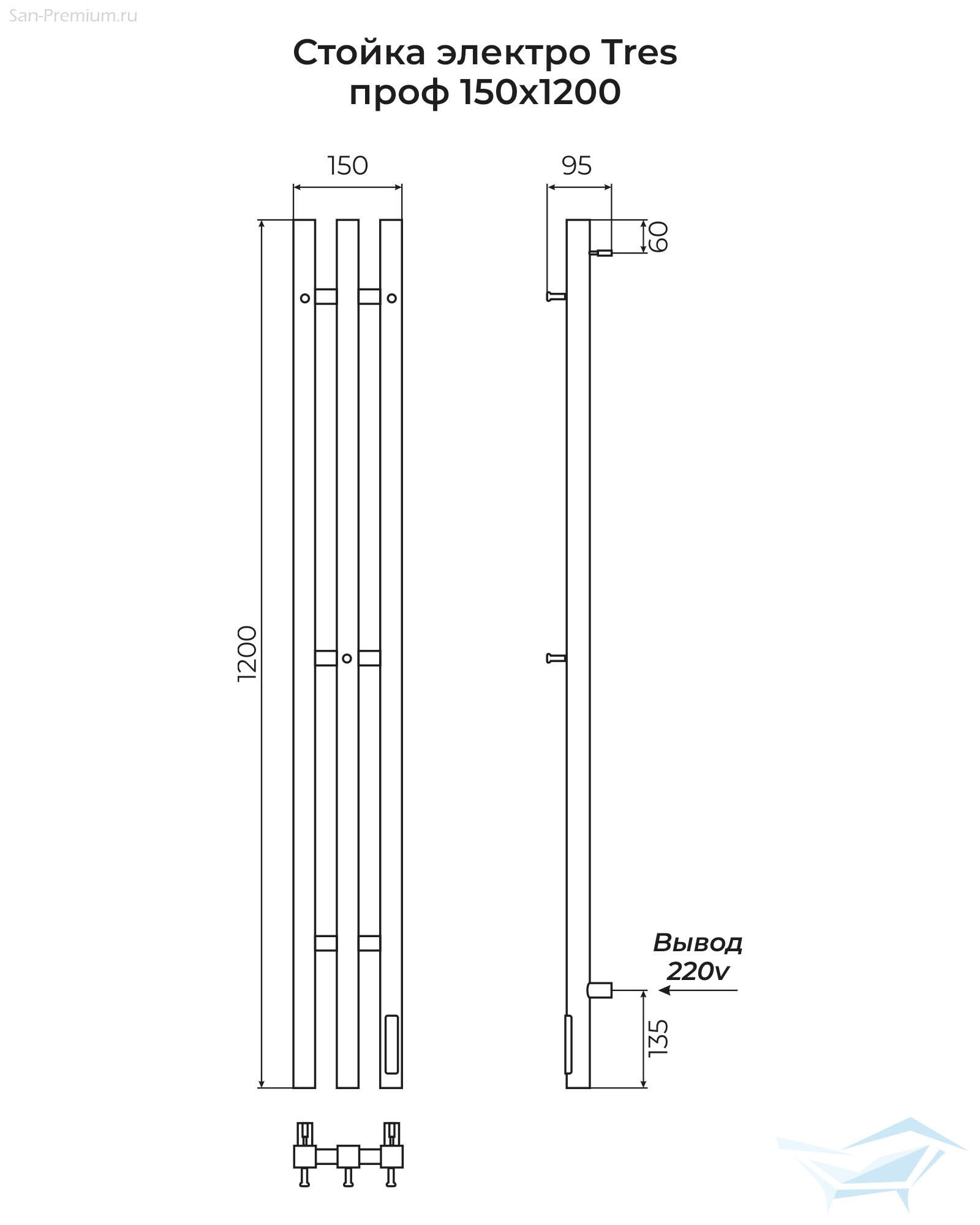 Полотенцесушитель электрический Terminus Tres Проф 1200, стойка, 3 крючка, белый матовый / 4670078561947