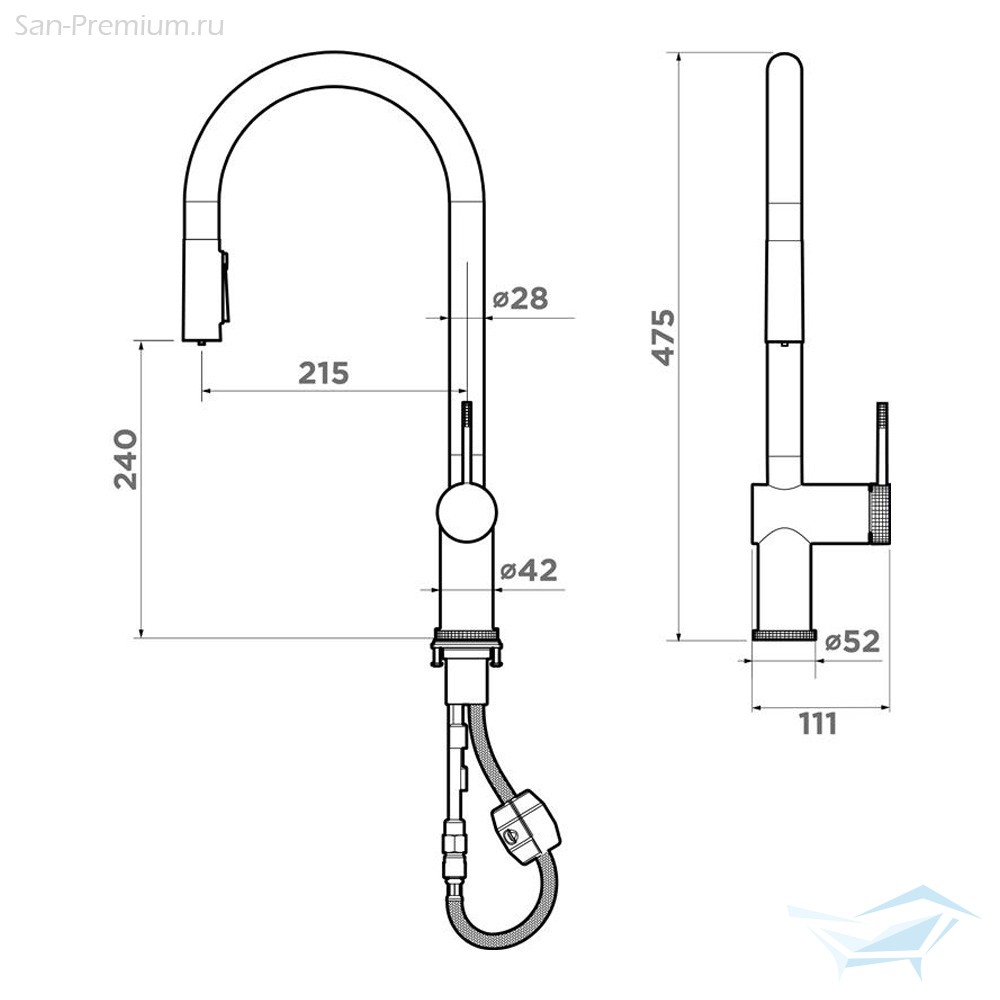 - Вытяжной шланг обеспечивает свободу движений: мытьё продуктов, наполнение высокой посуды и уход за мойкой становятся заметно удобнее.
