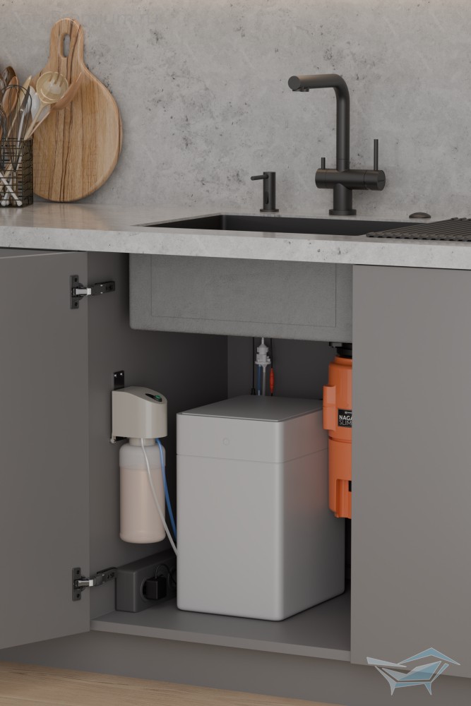 Первое подключение. Всё, что нужно, — разместить жидкость с насосом в подстольном пространстве согласно выбранной вами эргономике. Розетку можно разместить рядом с местом подключения измельчителя.