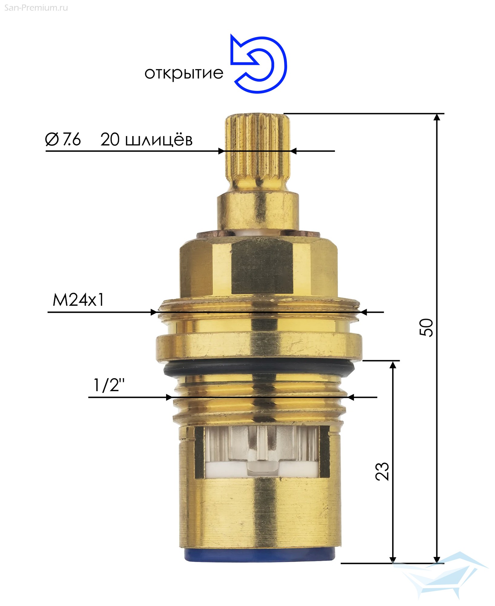 Оригинальная кран-букса Remer артикул 76DX керамическая, правая синяя, поворот 90°, 20 шлицев